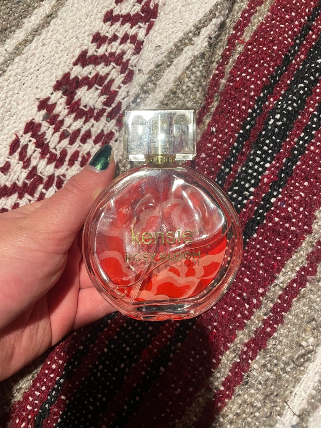 Women's perfume. Red floral design. Lightly used. Top sent: green apple, with a floral dry down.