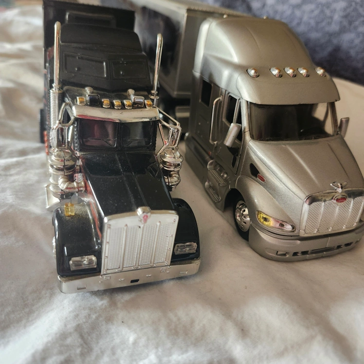Selling a set of two semi-trucks! One is a black Kenworth and the other is a silver Peterbilt. Both are in great condition and would be perfect for a collector or as a toy