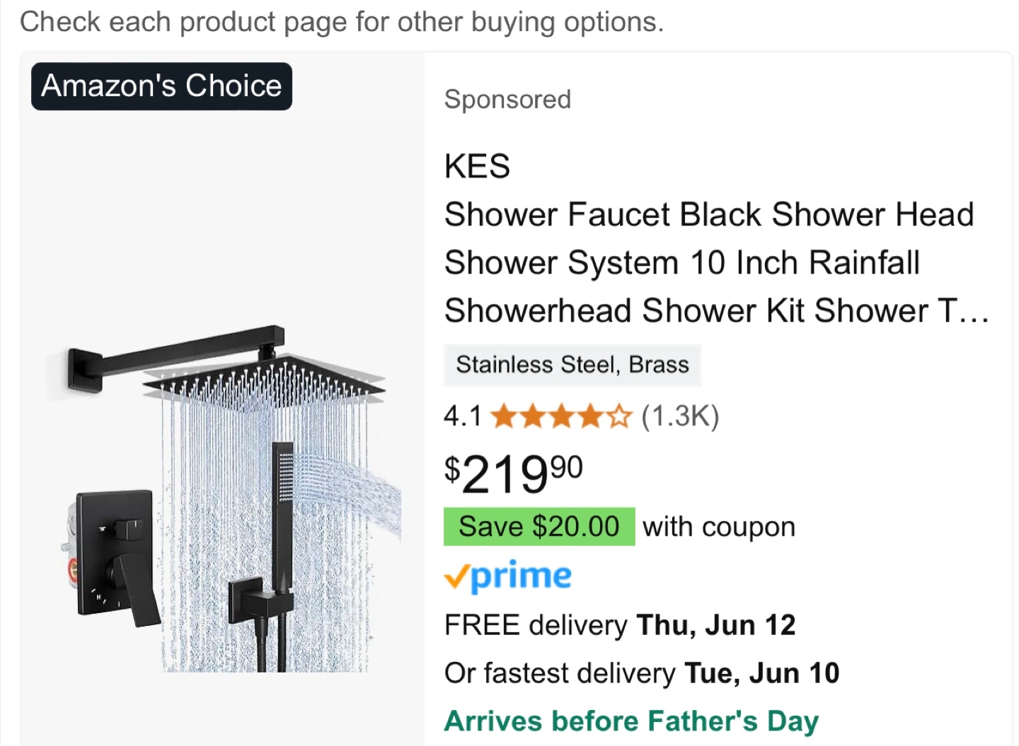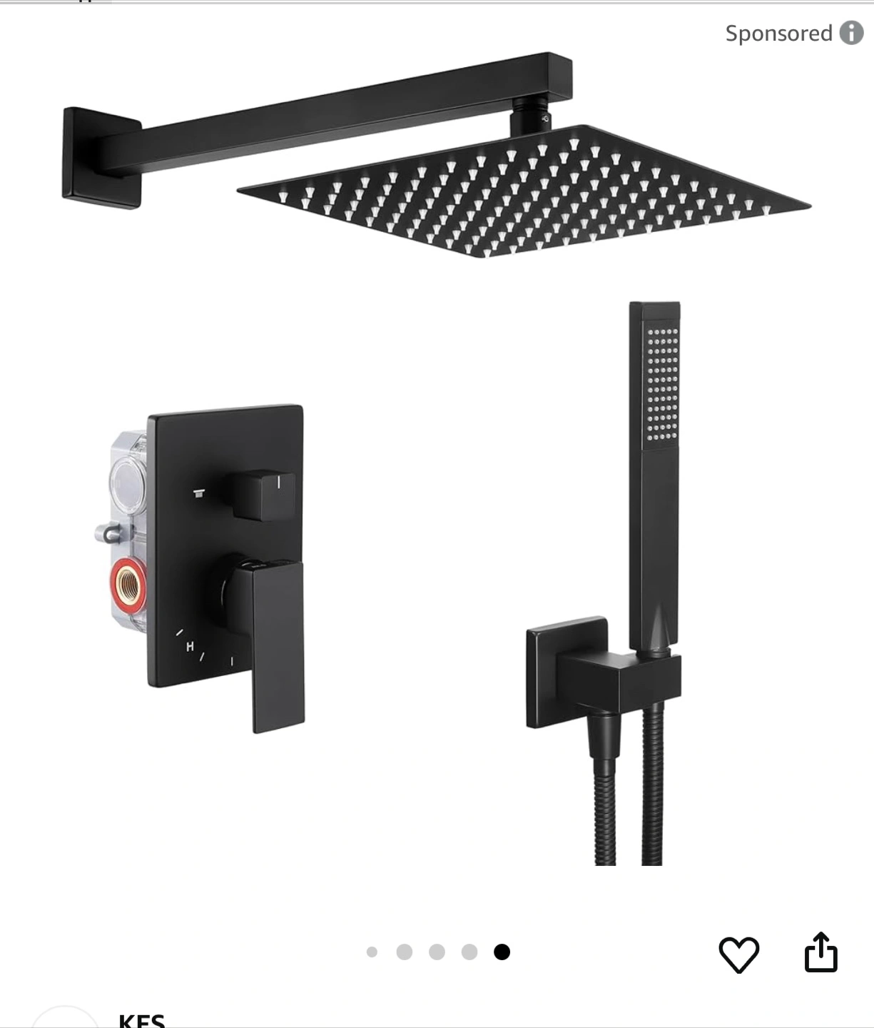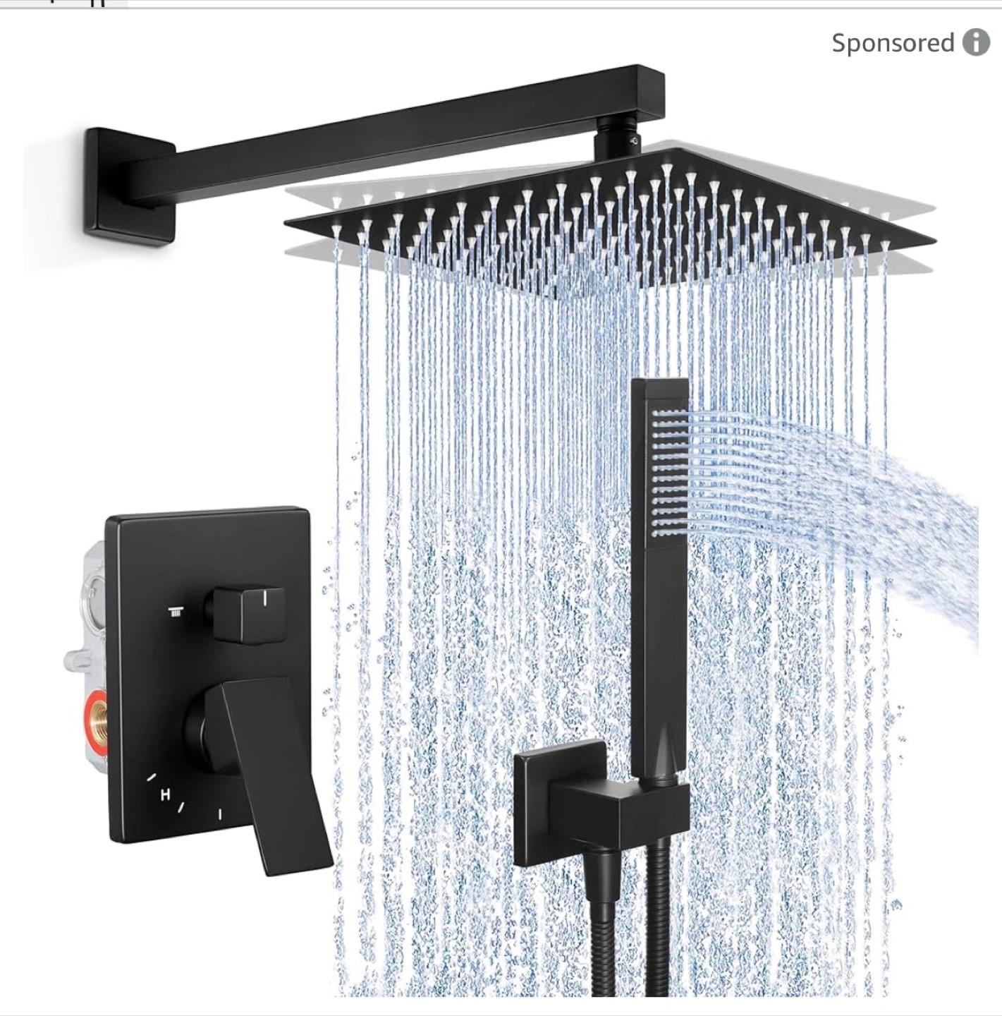 Selling a KES bathroom shower fixture set in matte black. It includes the rain shower head, handheld shower, and water control valve. Keep efficient simple!