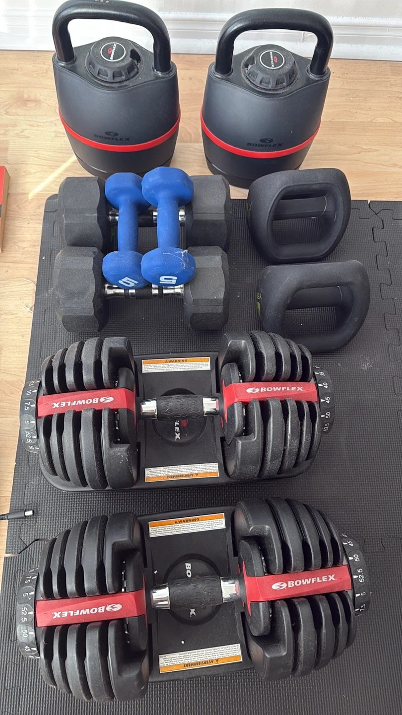 Selling a set of Bowflex adjustable kettlebells and dumbbells and a couple of standard dumbbells as well as an exercise bench! 2 x 25 lbs dumbbells 2 x 5 lbs (blue) dumbbells 2 x weight adjustable kettlebell with holding stand 2 x Ybells that can be used as a push-up stand, as a light kettlebell, also as a light dumbbell 2x weight adjustable dumbbells 1 exercise bench