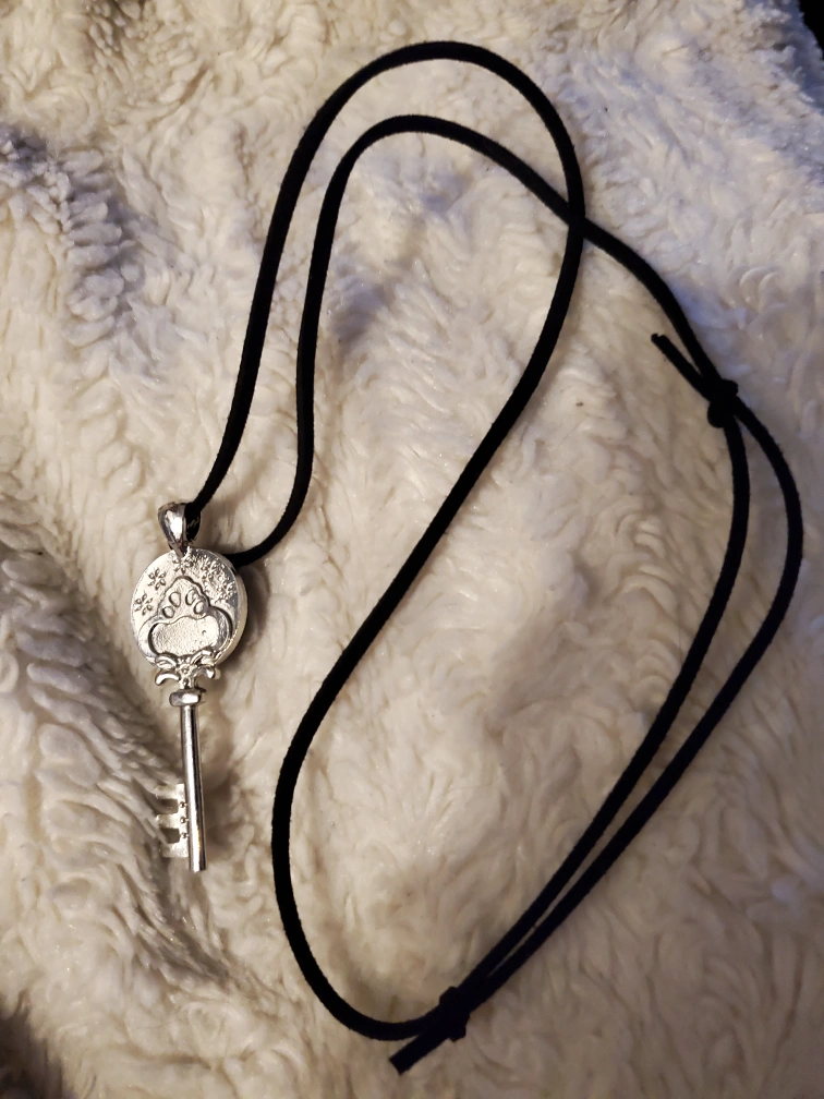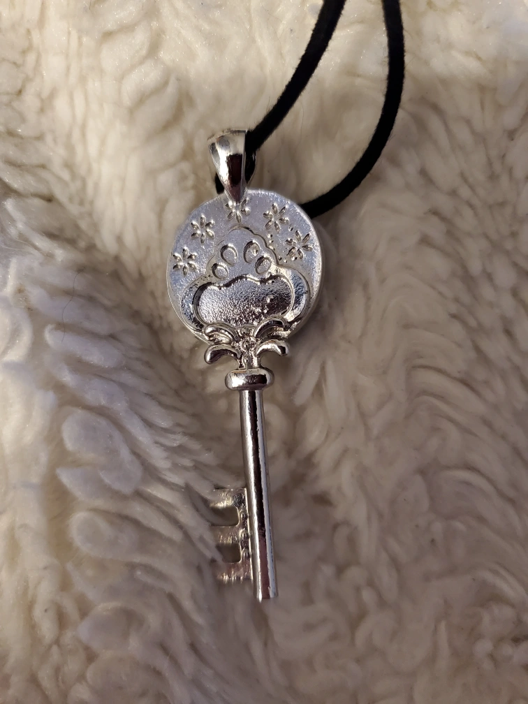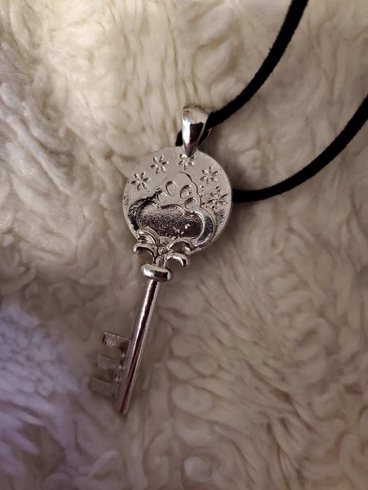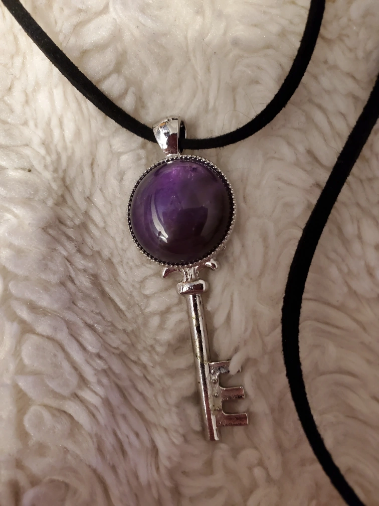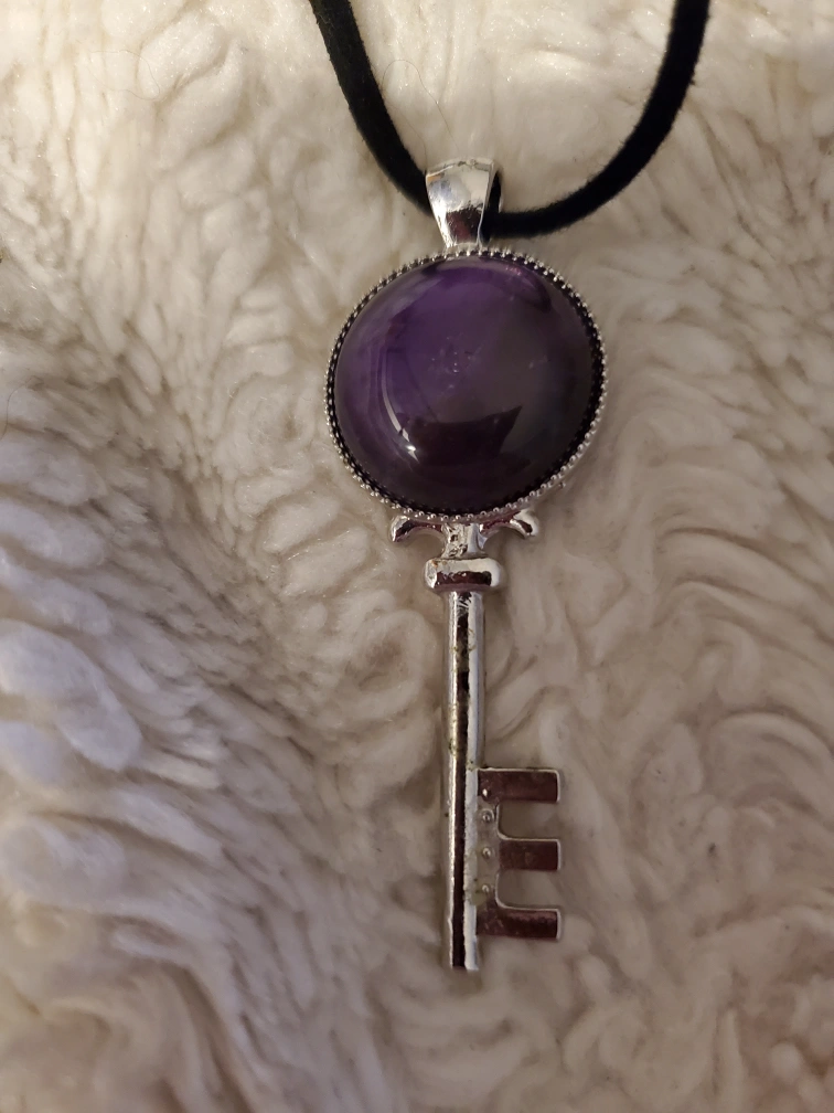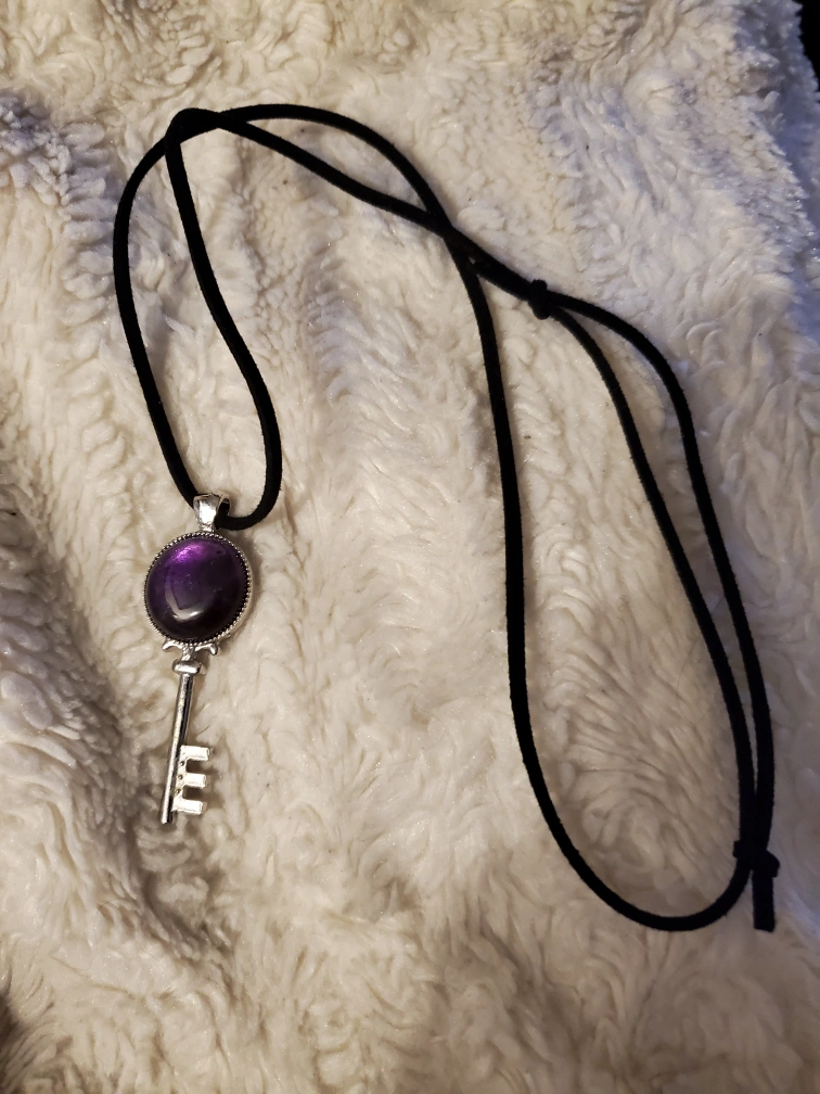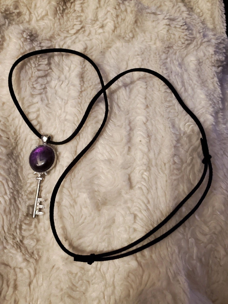 Unique key pendant necklace with a silver-tone key and a purple stone. The necklace has a black cord. It is in great condition and ready to add a touch of whimsy to your style! Cedar pick up.