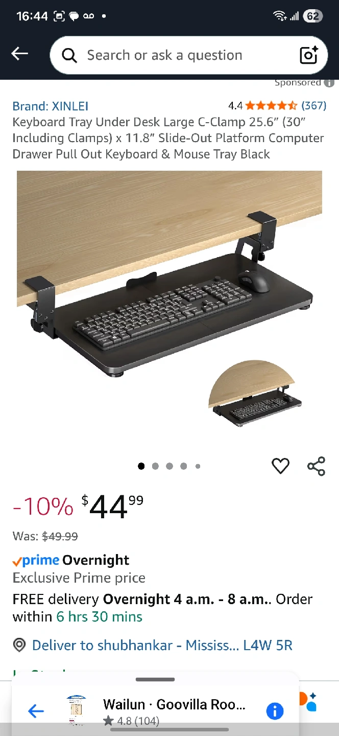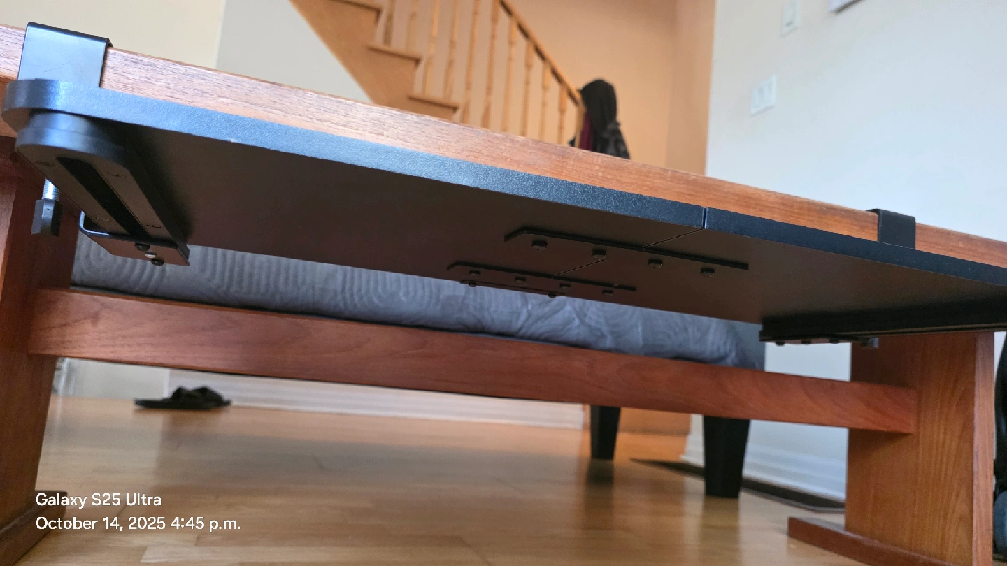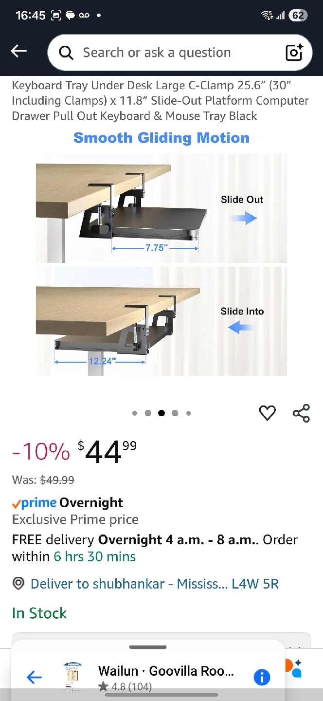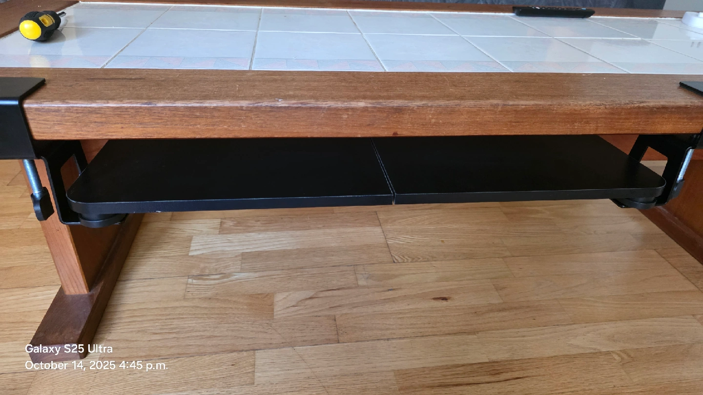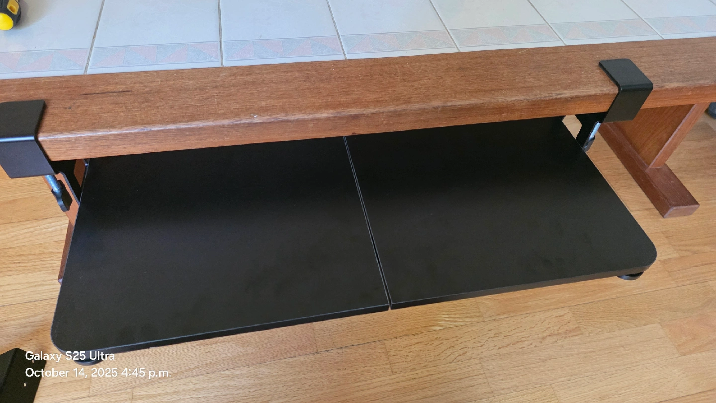 This is a keyboard tray under desk with a large C-clamp. It is 25.6" (30" including clamps) x 11.8" and has a slide-out platform. It's a computer drawer pull-out keyboard and mouse tray in black. It was originally priced at $49.99