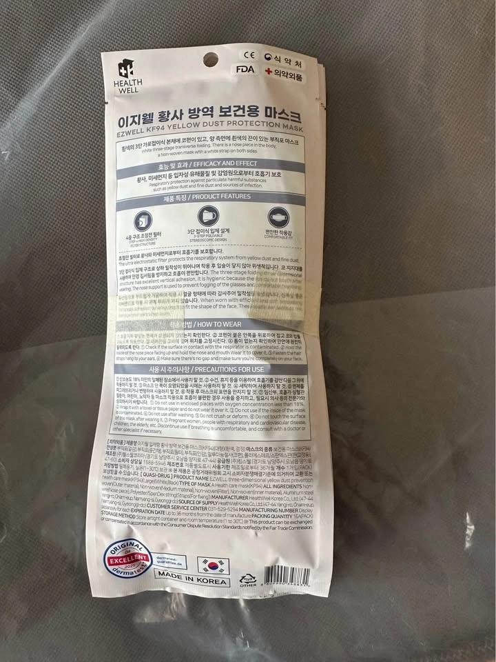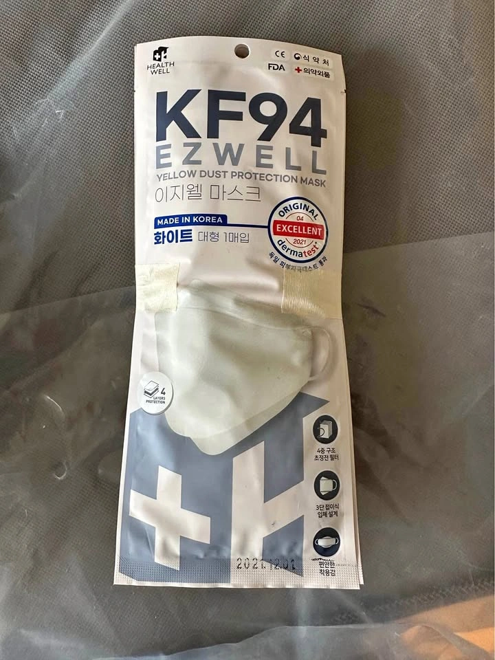 Stay protected with the KF94 Ezwell mask, specially designed to guard against yellow dust and other airborne particles. Made in Korea, this mask combines comfort and efficacy, making it an essential item for daily use. **Key Features:** - **KF94 Certification:** This mask meets the rigorous KF94 standards, ensuring a high level of filtration efficiency against fine dust and harmful particles. - **Comfortable Fit:** Designed for all-day wear, the mask features adjustable ear straps and a breathable fabric that allows for easy breathing while providing a secure fit. - **Multi-Layer Protection:** The mask's multi-layer structure effectively filters out airborne contaminants, offering reliable protection in various environments. - **Easy to Use:** The straightforward design makes it easy to wear and remove, ensuring convenience for everyday activities. - **Made in Korea:** Ensures the highest quality and safety standards.
