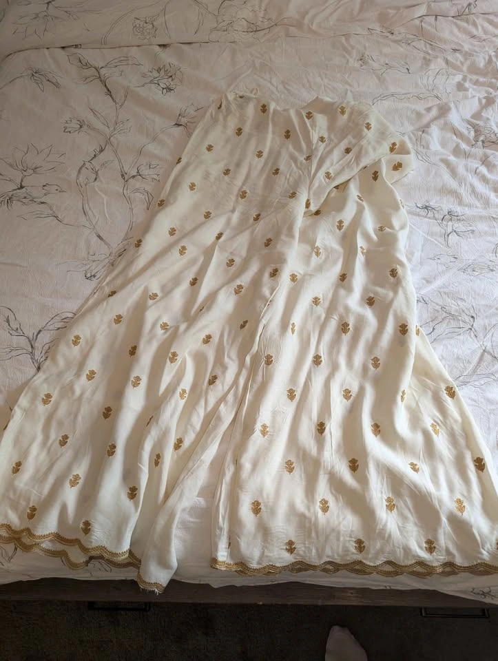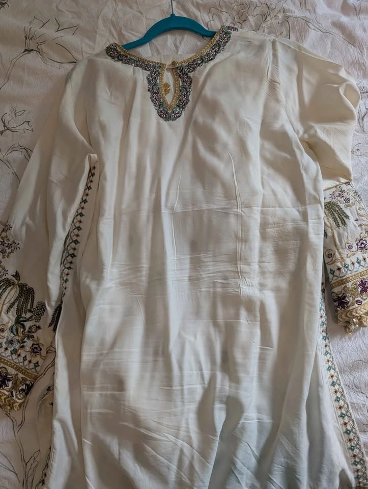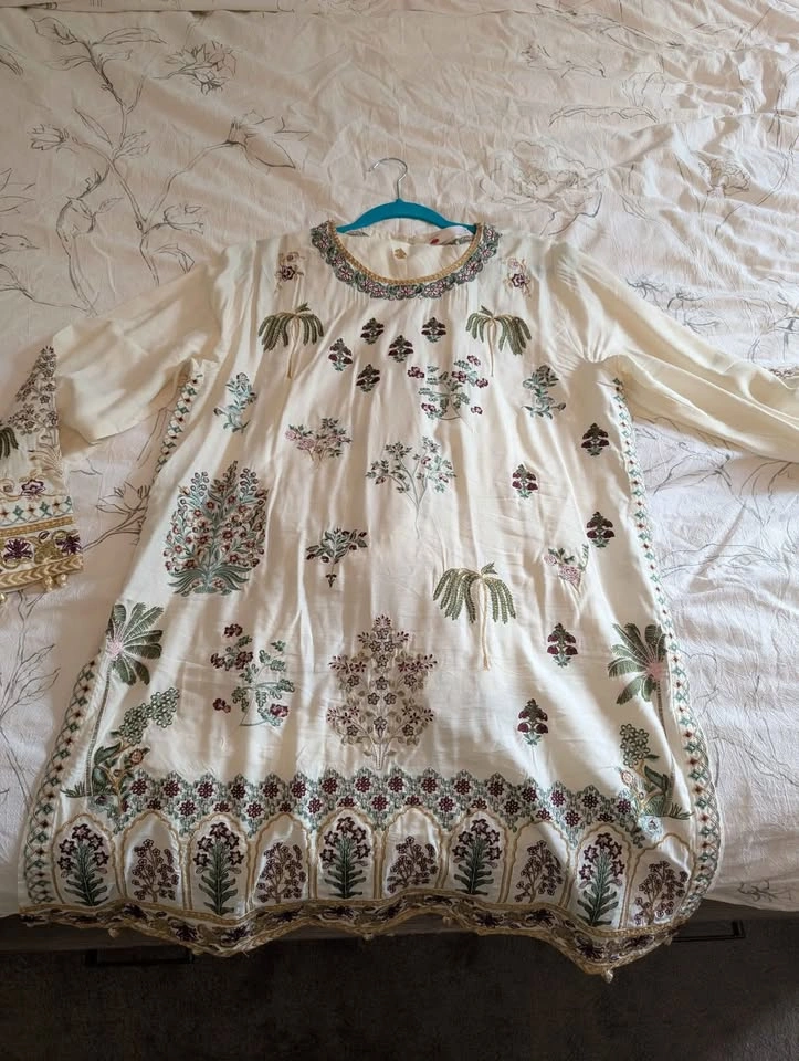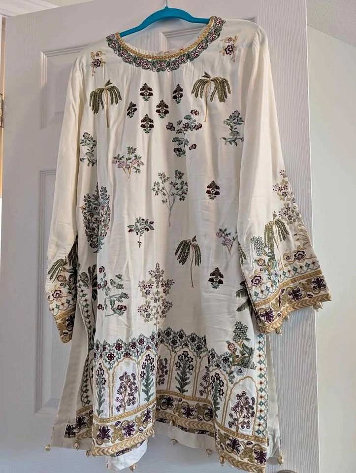 Beautiful 2-piece Khaadi kurta set with wide-legged palazzo pants. Cotton with embroidery all over including the pants. Size 16. Worn only once.