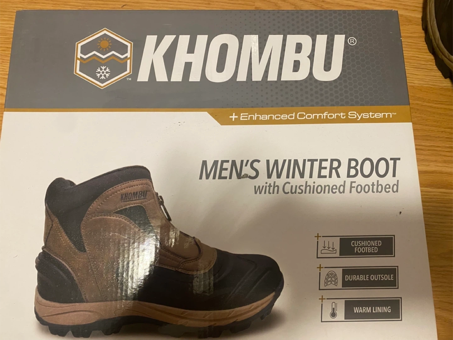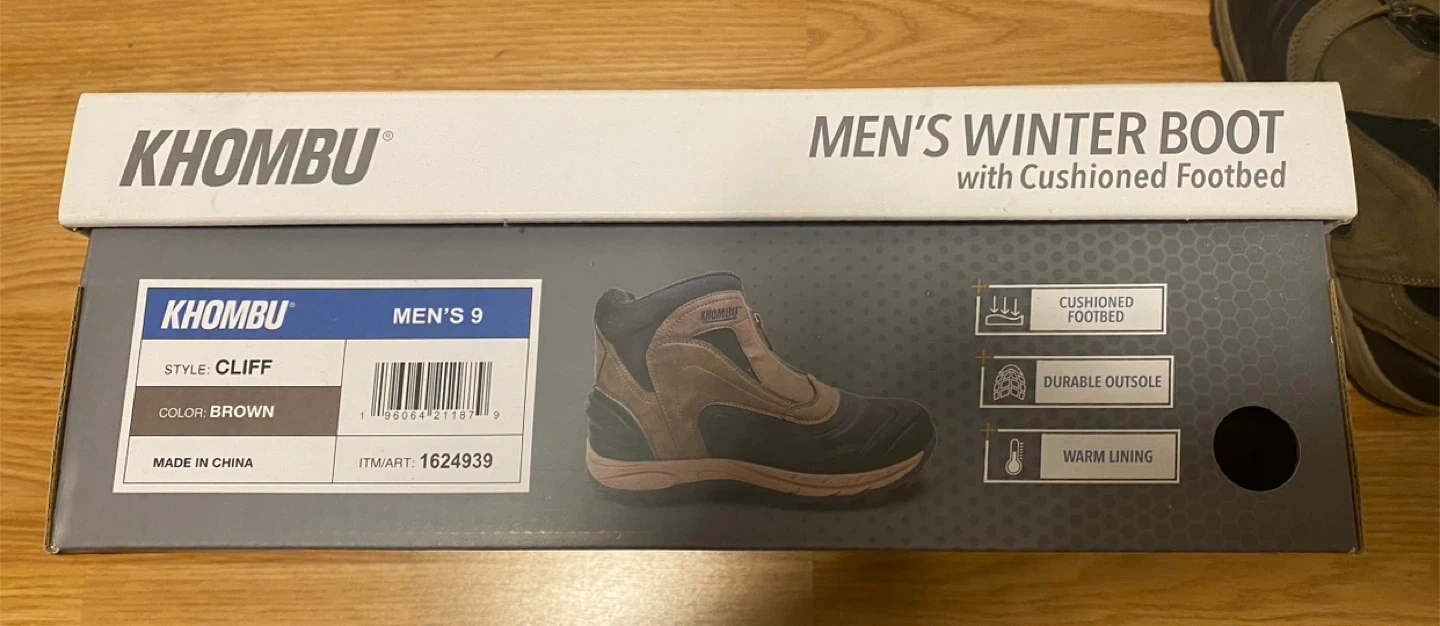 Khombu Men's Winter Boots with cushioned footbed. - Enhanced Comfort System - Durable Outsole - Warm Lining - Cushioned Footbed Size: Men's 9 Style: Cliff Color: Brown Box included!