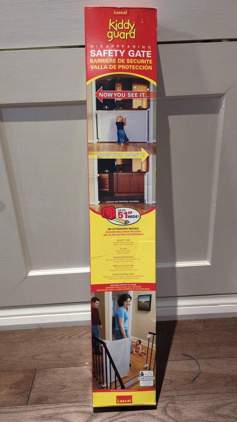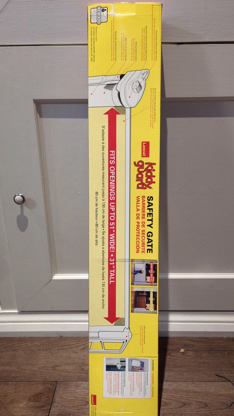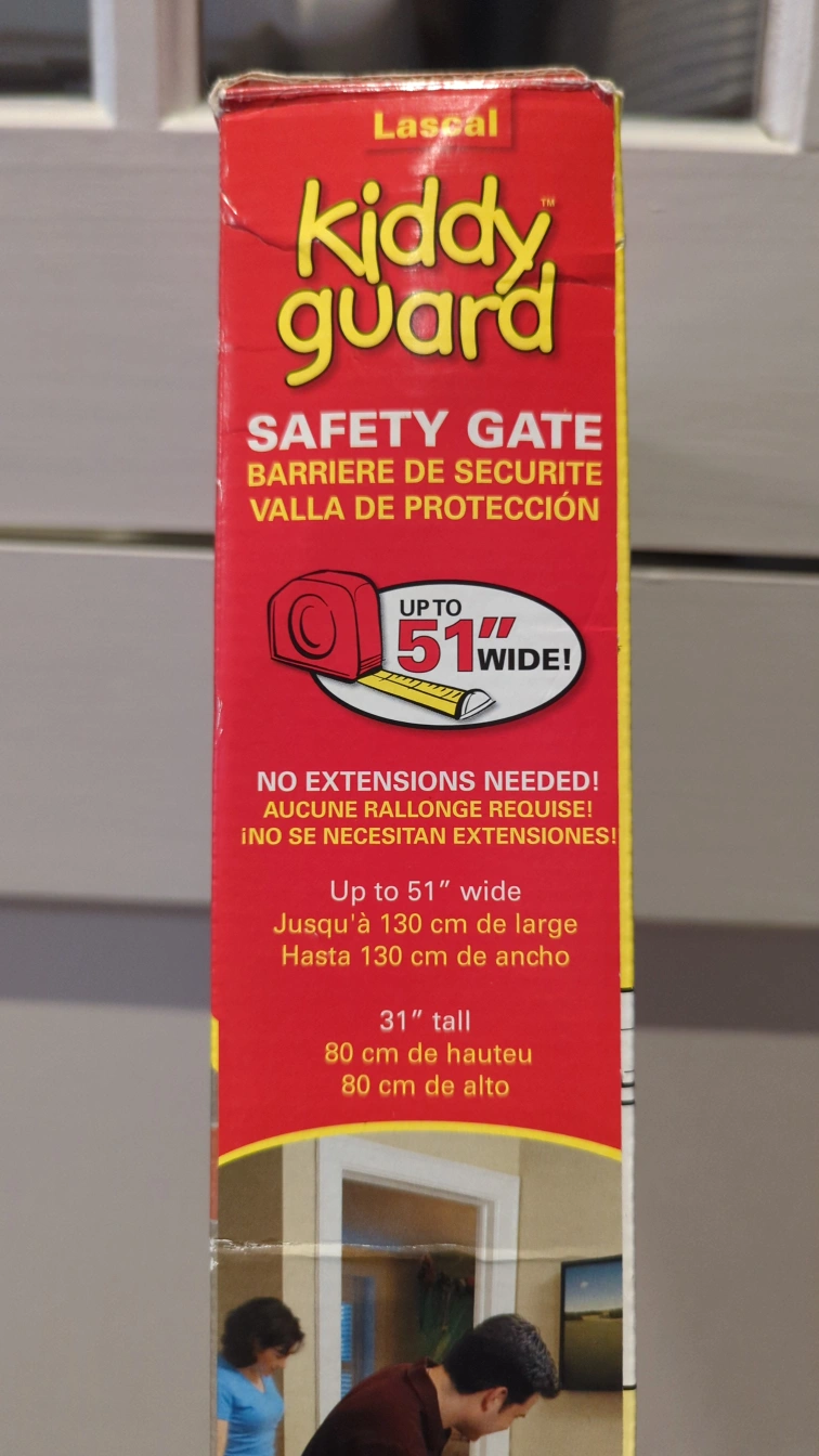 I am offering a Kiddy Guard safety gate that is up to 51 inches wide. Designed to fit openings up to 51 inches wide and 31 inches tall, it can offer a calming sense of security knowing your child can play safely in the space it protects.