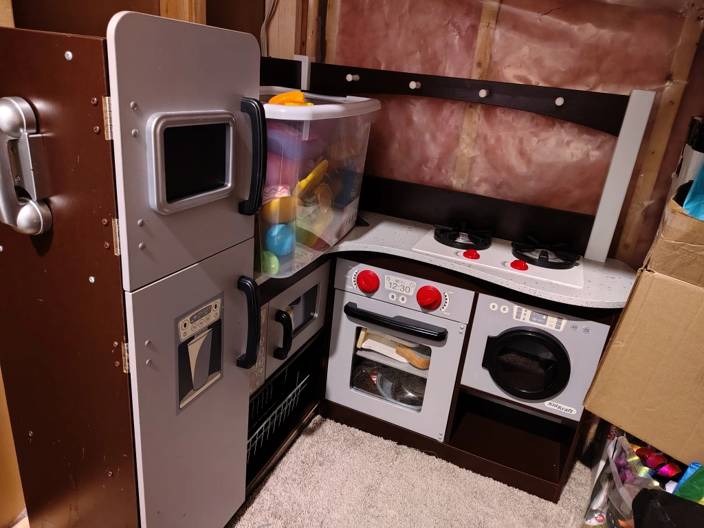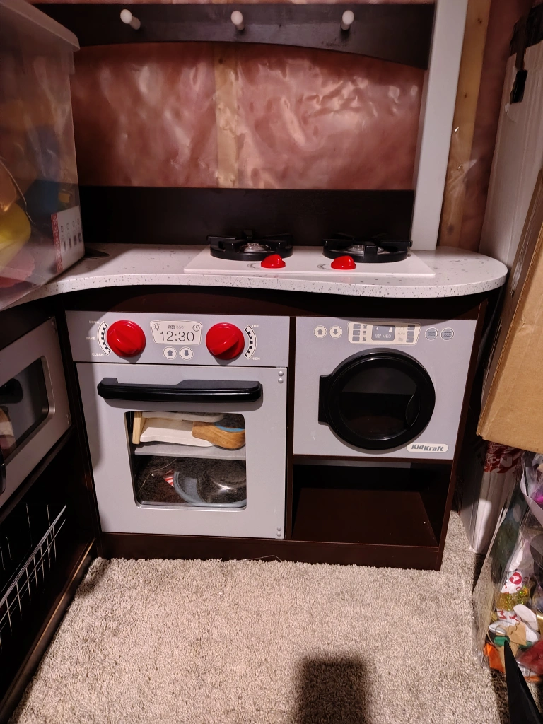 This is a KidKraft wooden kitchen playset! It includes a fridge, oven, microwave, and washing machine. Great for kids to play with and let their imagination run wild Comes with plastic food, pots and pans, wooden mixer and wooden Keurig.