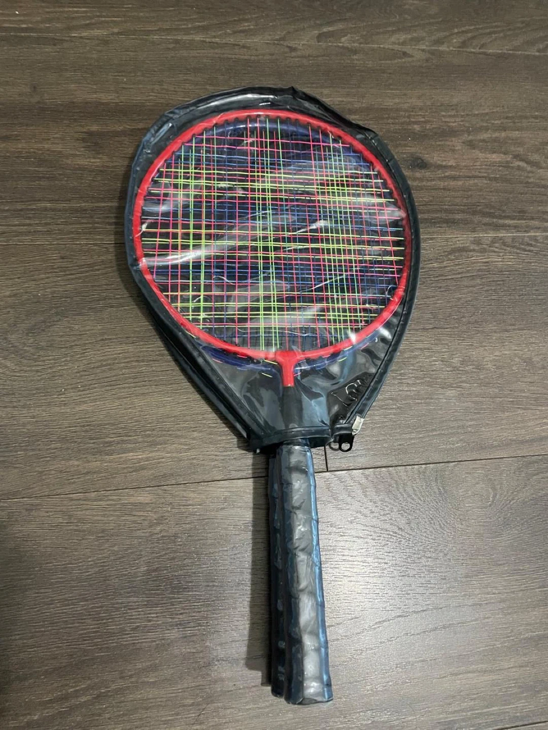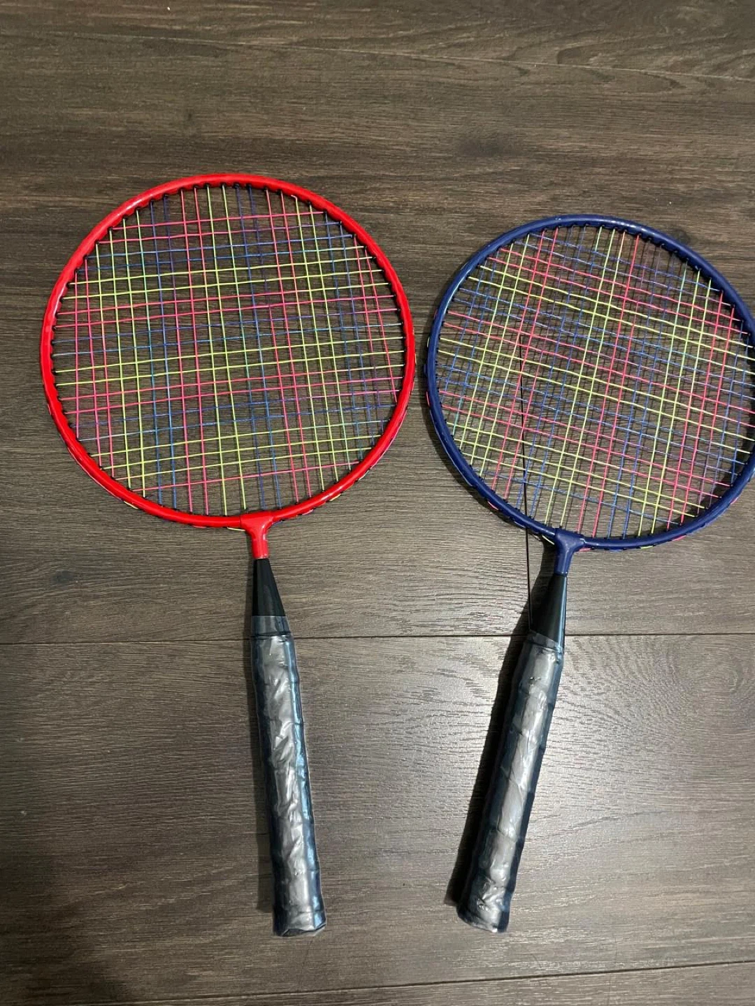 Selling a pair of badminton rackets, one in red and one in blue! They're in great shape and ready for some fun games outside