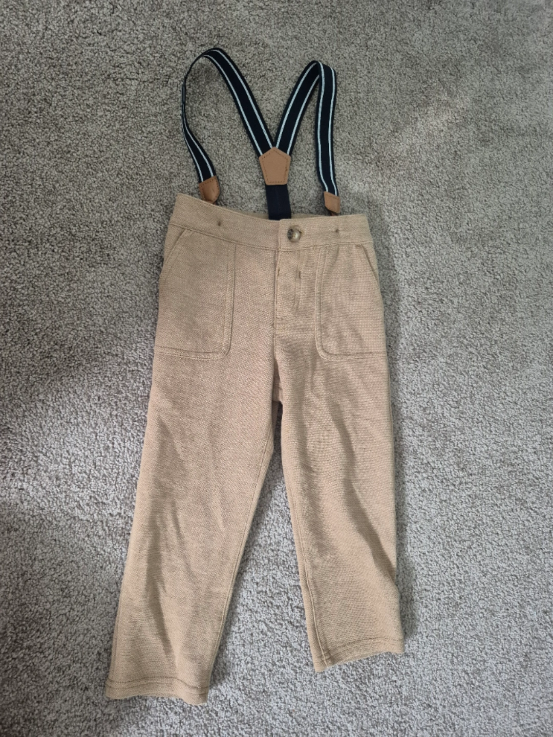 Cute beige pants with attached suspenders for your little one! These are in great condition and ready for a new home. Perfect for a stylish and comfortable outfit!