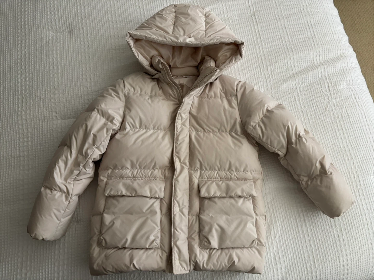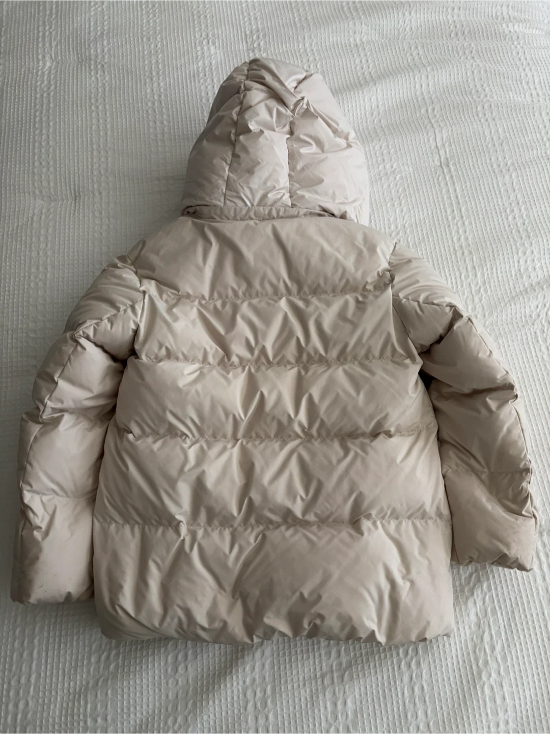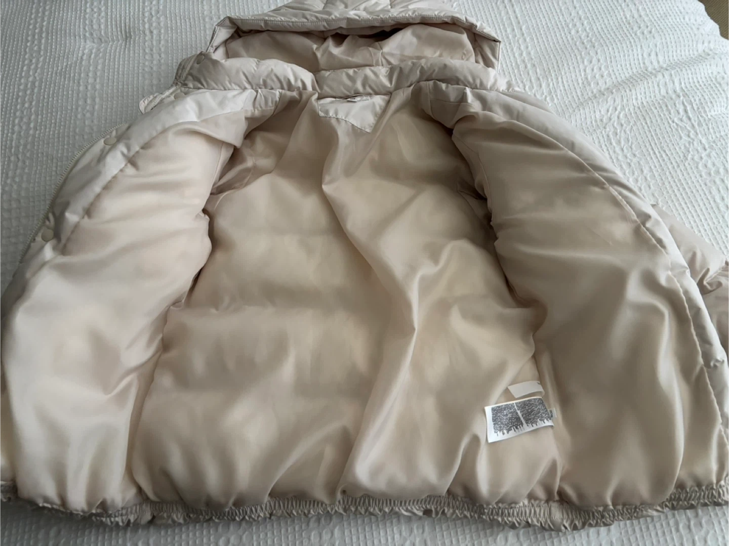 Selling a Kids puffer jacket in a lovely beige colour. It's in great condition and perfect for keeping your little one warm during the colder months. The jacket features a hood and convenient pockets, making it both stylish and practical for everyday wear
