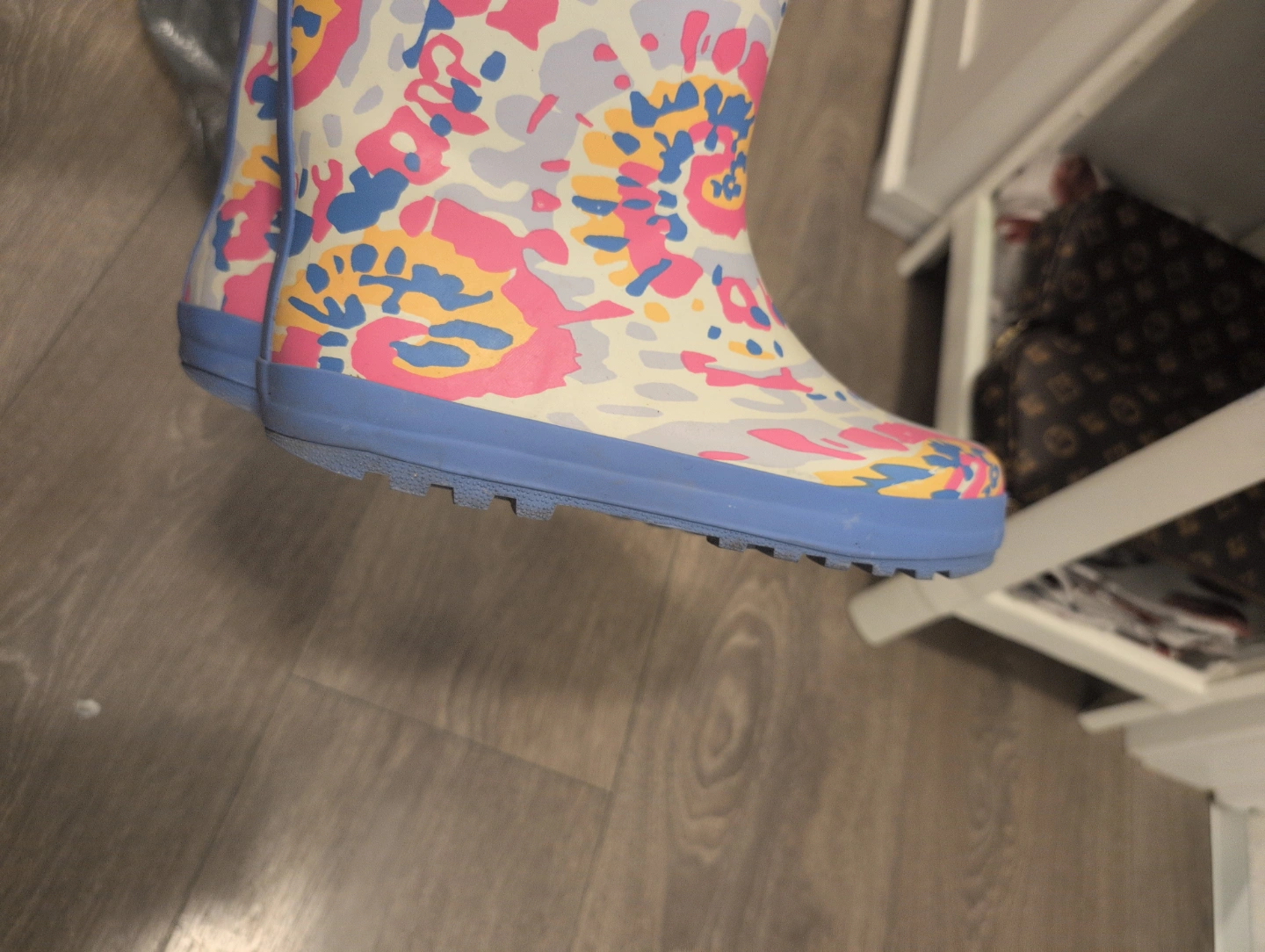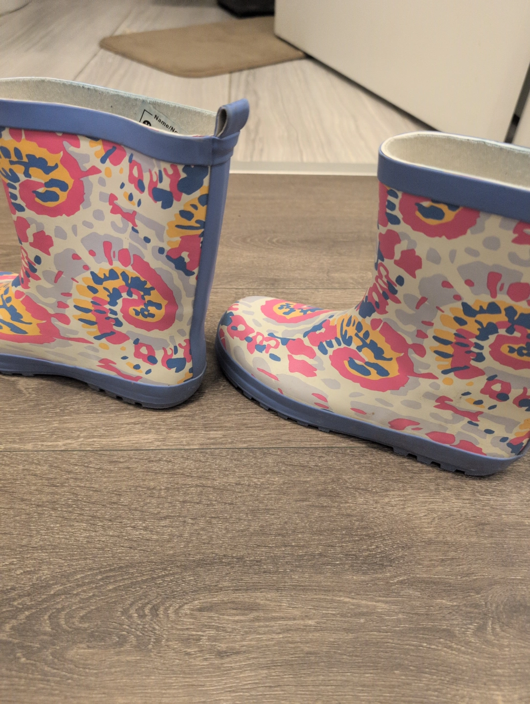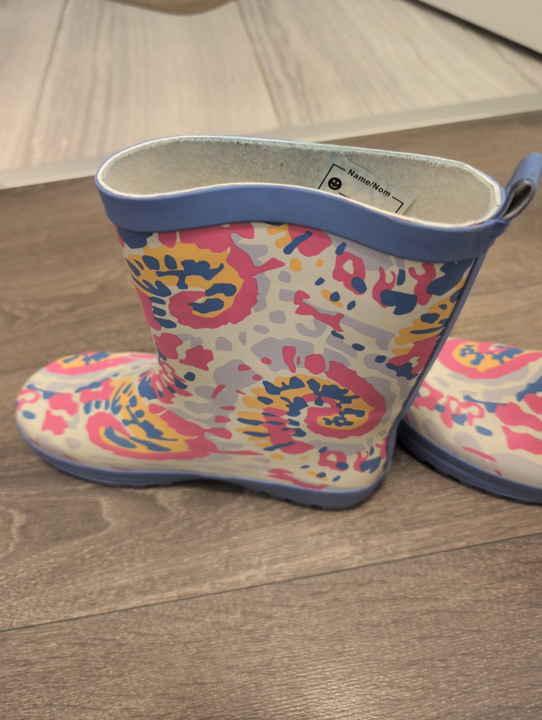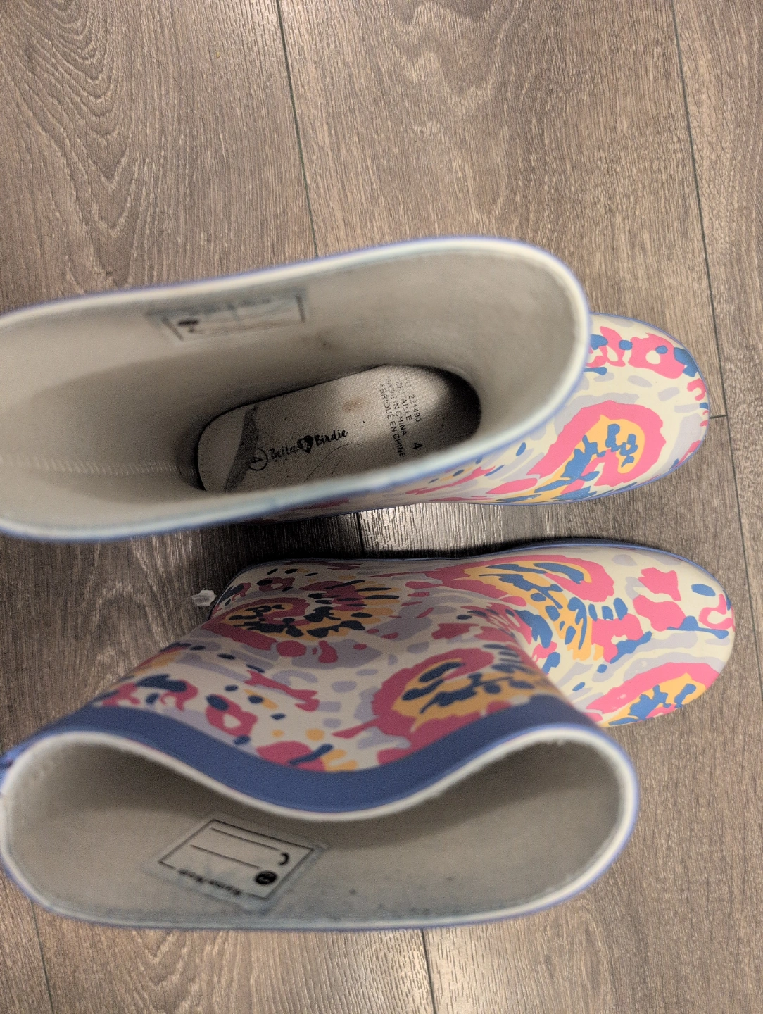 Adorable floral rain boots. Size 4. Great for rainy days. Name/Nom label inside. fits 5 as well and grown women as well... acts as waterproof cover for legs