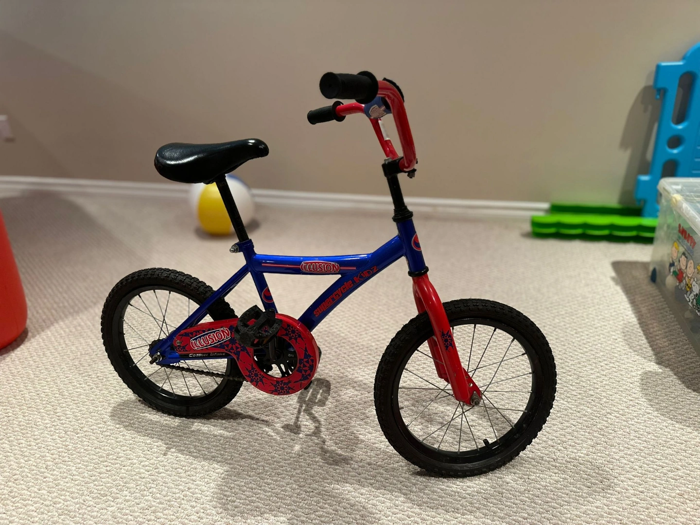 Blue and red children's bicycle. Small size, coaster brake. Good used condition.