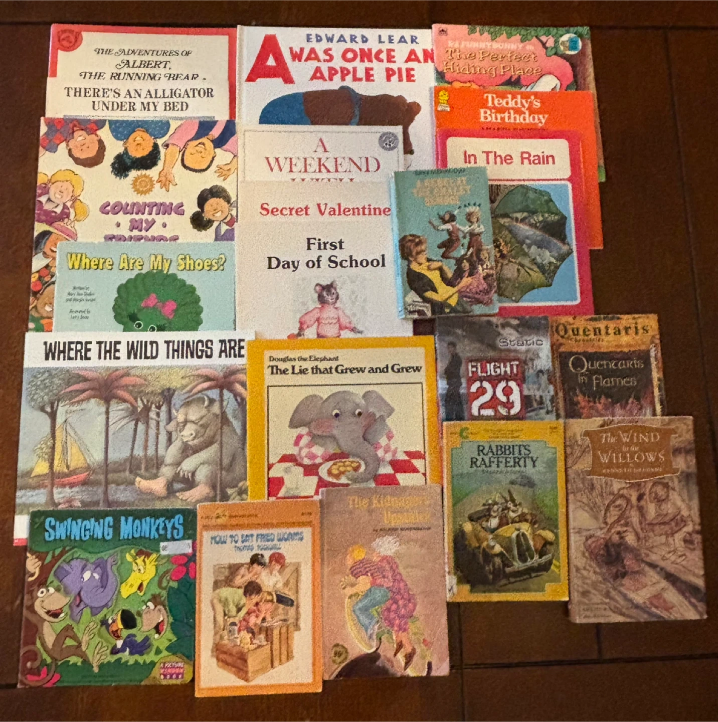Selling a bundle of kids books! Titles include "The Wind in the Willows", "Secret Valentine", "The Adventures of Albert, The Running Bear", "Where the Wild Things Are", "A Weekend With Wendell", "Counting My Friends", "There's an Alligator Under My Bed", "Swinging Monkeys", "In The Rain", "Rabbits Rafferty", "How to Eat Fried Worms", "First Day of School", "Teddy's Birthday", and "Douglas the Elephant The Lie that Grew and Grew"! Perfect for young readers