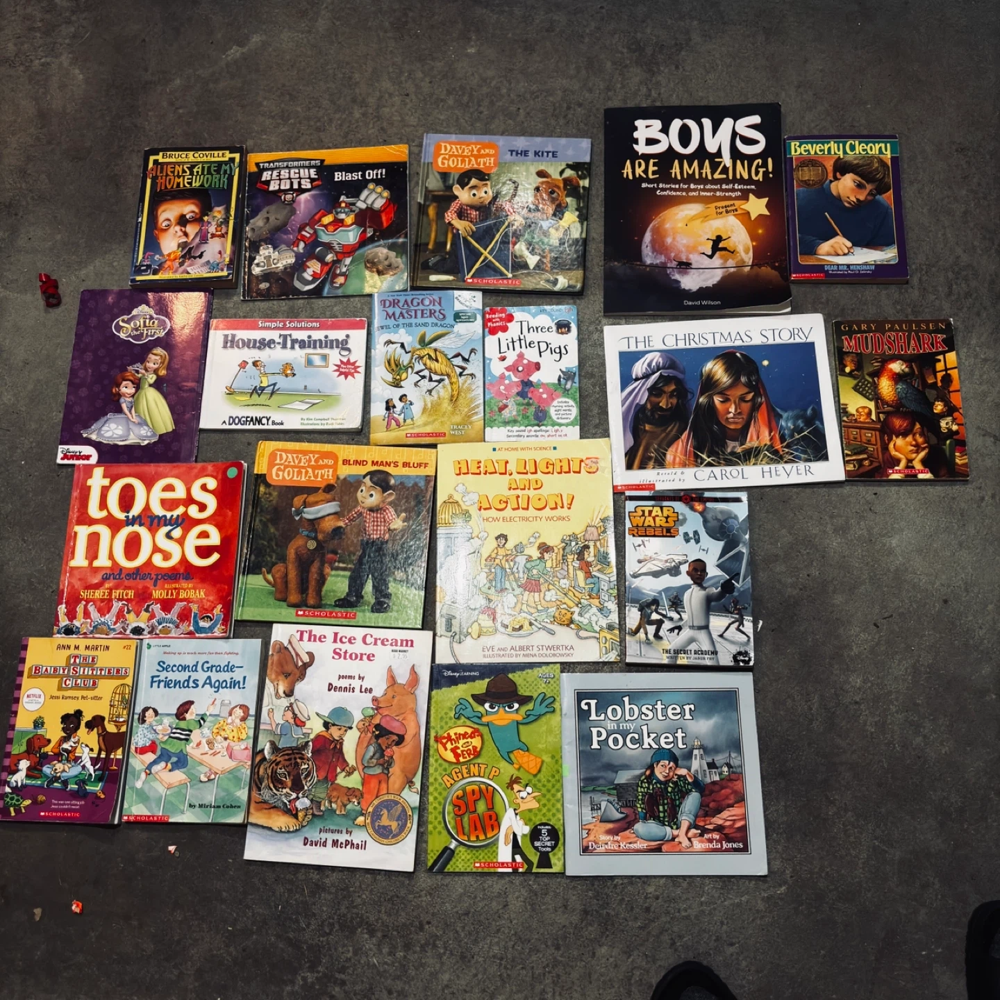 Selling a bundle of children's books! Includes a variety of titles such as: - Aliens Ate My Homework by Bruce Coville - Transformers Rescue Bots: Blast Off! - Davey and Goliath: The Kite - Sofia the First - House-Training: A DOGFANCY Book - Dragon Masters: Jewel of the Sand Dragon - Three Little Pigs - Boys Are Amazing! by David Wilson - Dear Mr. Henshaw by Beverly Cleary - The Christmas Story by Carol Heyer - Mudshark by Gary Paulsen - Toes in My Nose and Other Poems by Sheree Fitch and Molly Bobak - Davey and Goliath: Blind Man's Bluff - Heat, Lights, and Action! - Star Wars Rebels: The Secret Academy - The Baby-Sitters Club: Jessi Ramsey, Pet-Sitter by Ann M. Martin - Second Grade-Friends Again! by Miriam Cohen - The Ice Cream Store: Poems by Dennis Lee - Phineas and Ferb: Agent P Spy Lab - Lobster in my Pocket by Deirdre Kessler