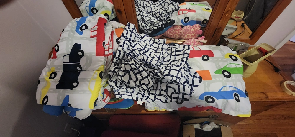 Kids comforter and sheet set with a fun car print! Perfect for a toddler bed or crib. The set includes a comforter and fitted sheet with colourful cars.