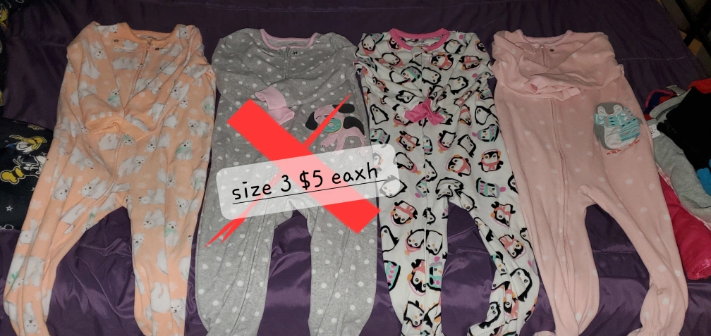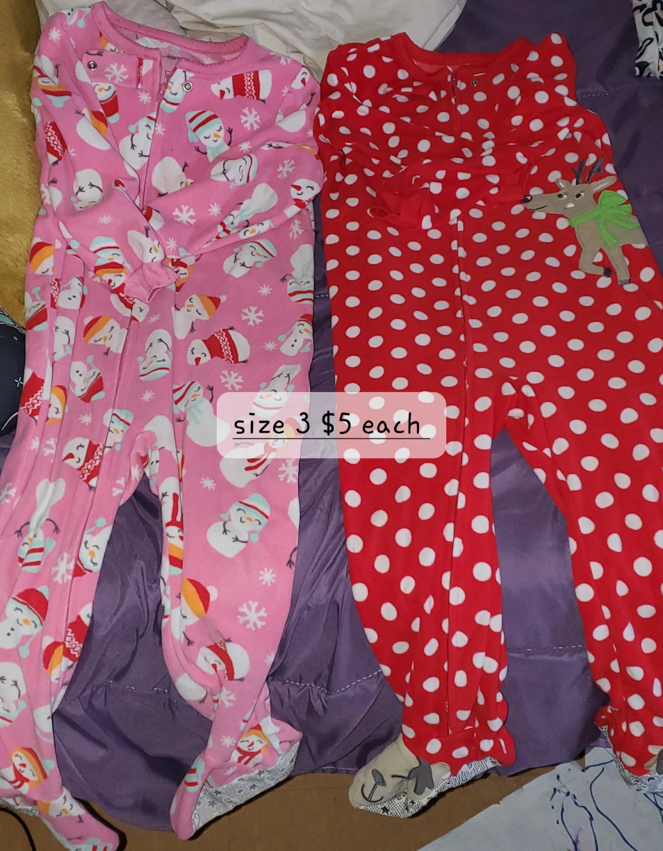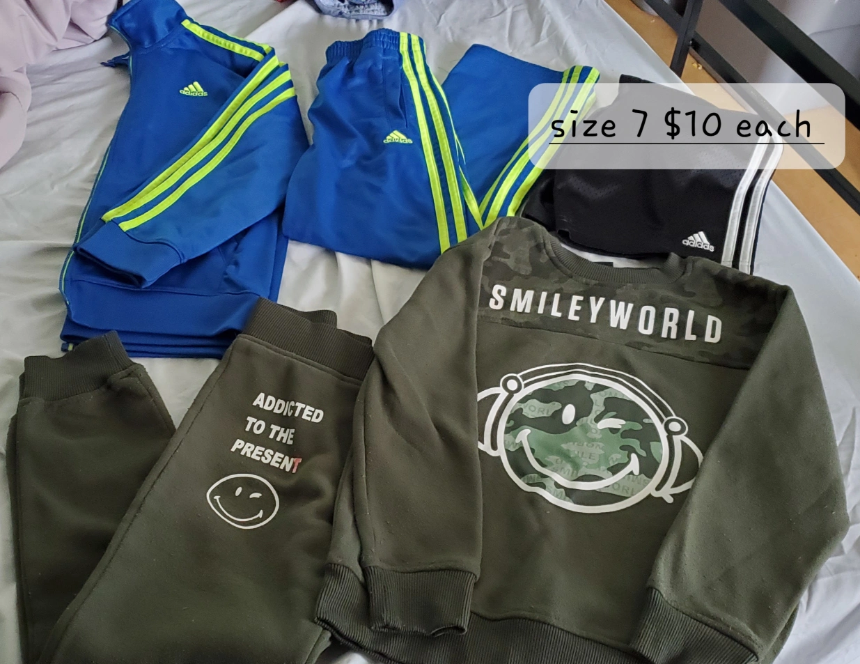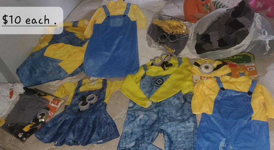 Selling a variety of kids' clothing items! There are pajamas in size 3, Adidas tracksuits in size 7, and some Minion costumes. All items are in good condition and ready for a new home!