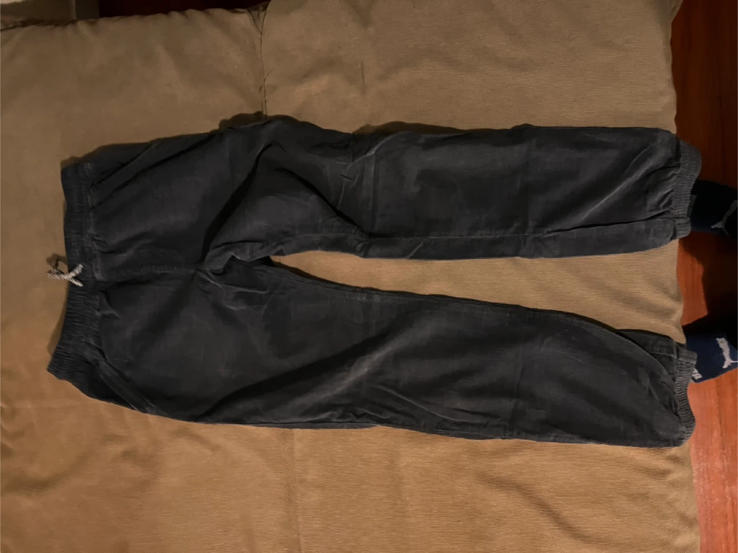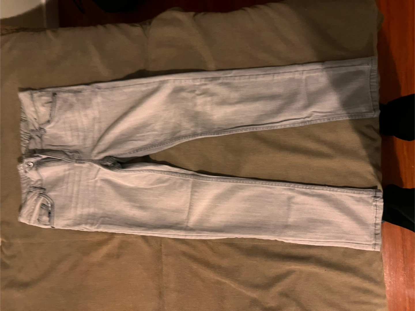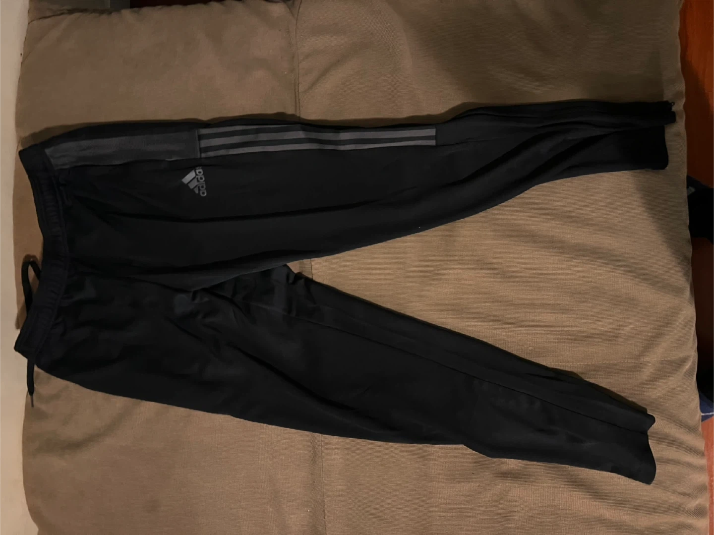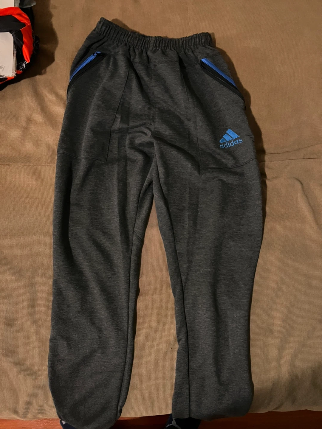 T shirt grey- 15$ kids small Adidas joggers 40 kids medium Grey jeans - 25- kids medium Black sweats 30 - kids large Adidas black and blue 30$- kids large 125 for all!