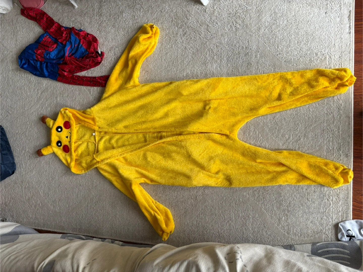 A bundle of kids' costumes including: - A Pikachu onesie - 140 - A Spiderman costume - 120 - An Aladdin costume - 110 - A Ninja costume - 120 Perfect for dress-up or Halloween!
