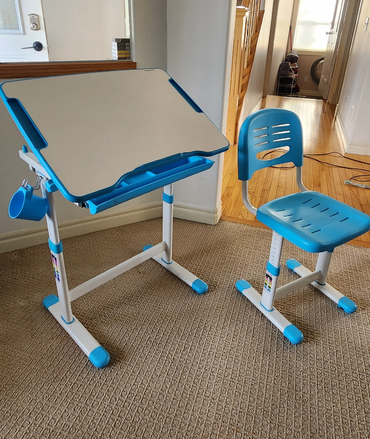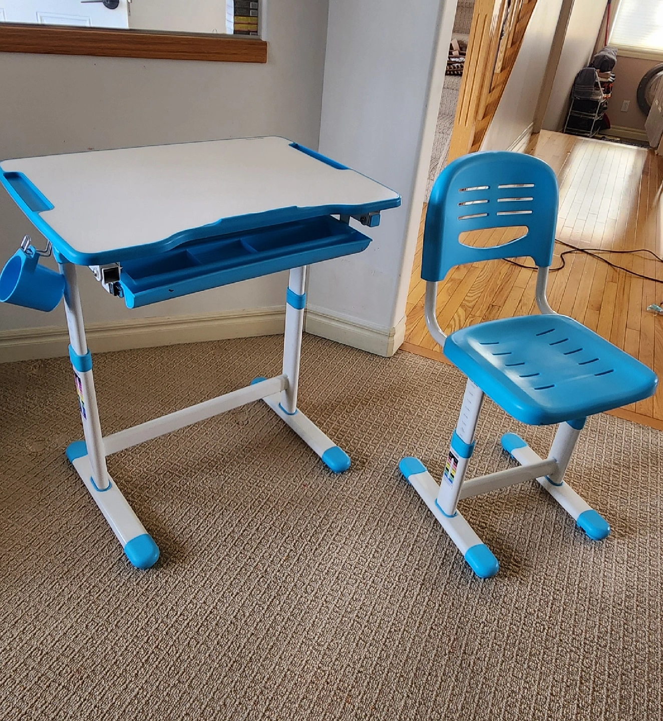 Selling a super cute kids desk and chair set! It's in great shape and perfect for a little one's study or play area. The chair is a nice, bright blue, and the desk is white with blue accents. It's a great set to help kids get comfortable while they learn and create. It's has metal legs and you can adjust the height.
