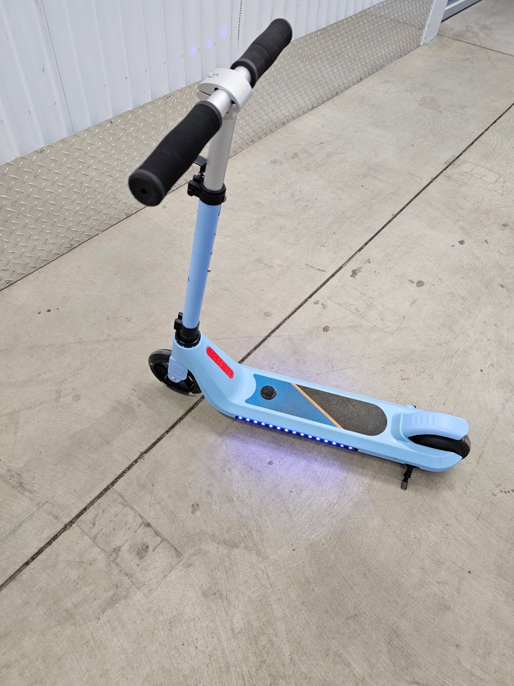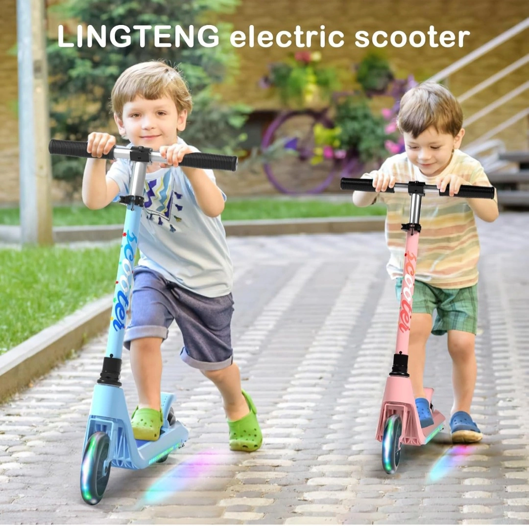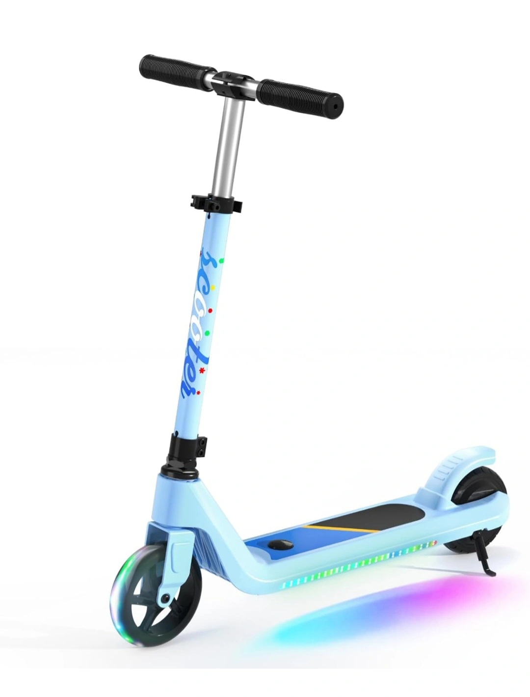 Electric scooter for kids, features a strong frame and stable tires, has four height adjustable handlebars, blue with colourful lights on wheels.