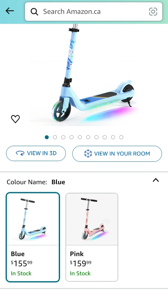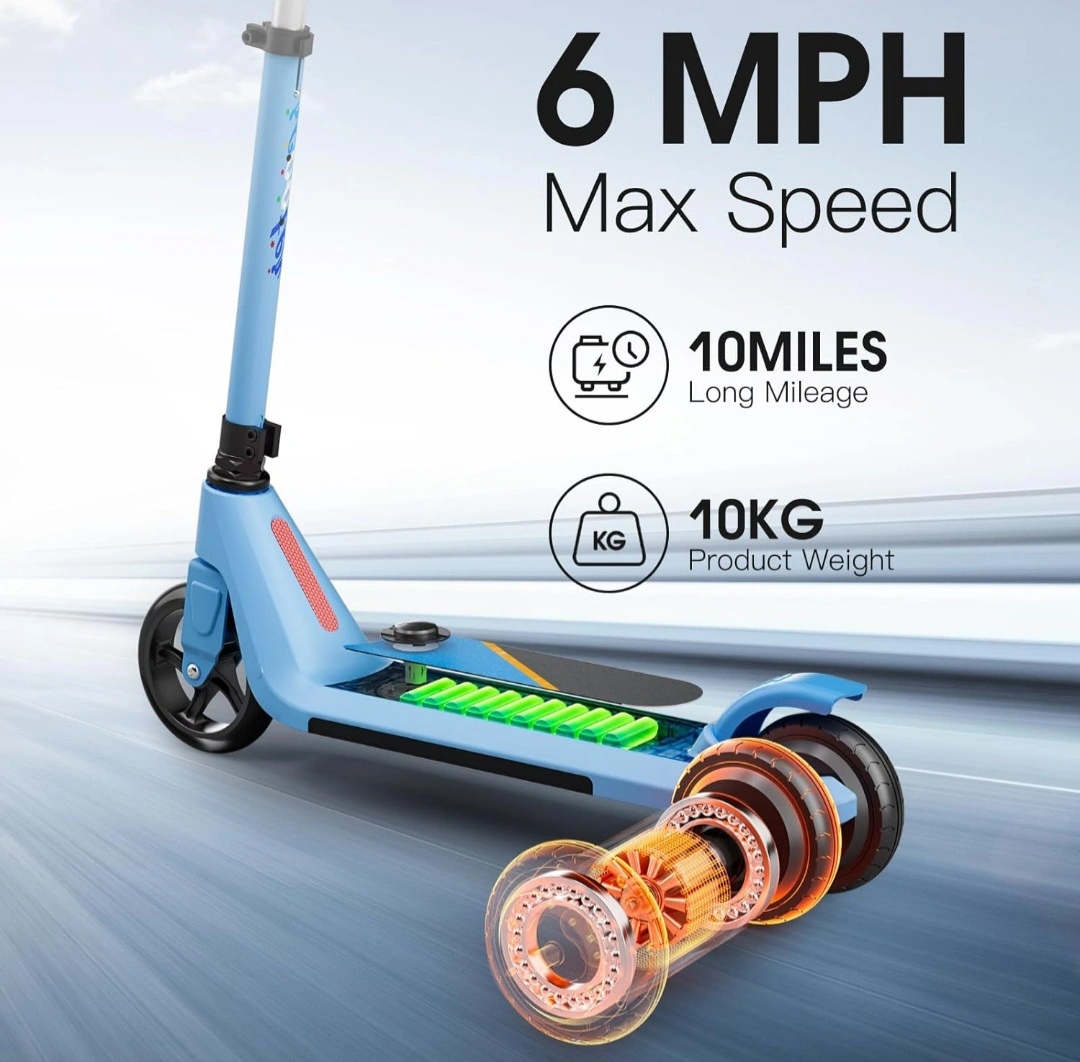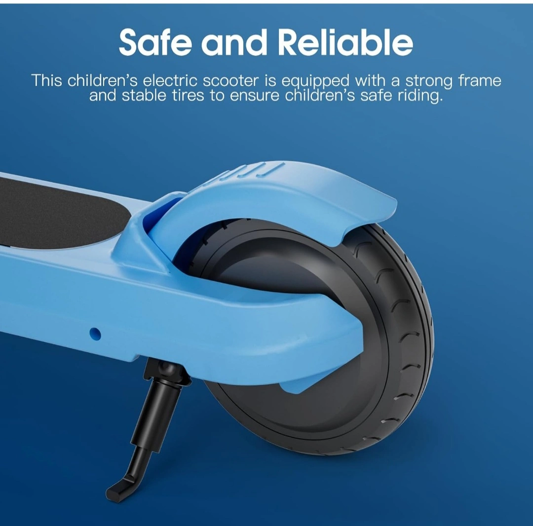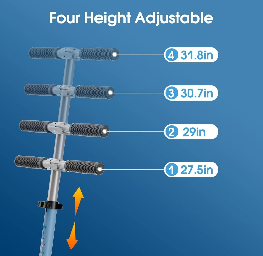 Electric scooter for kids, features a strong frame and stable tires, has four height adjustable handlebars, blue with colourful lights on wheels.