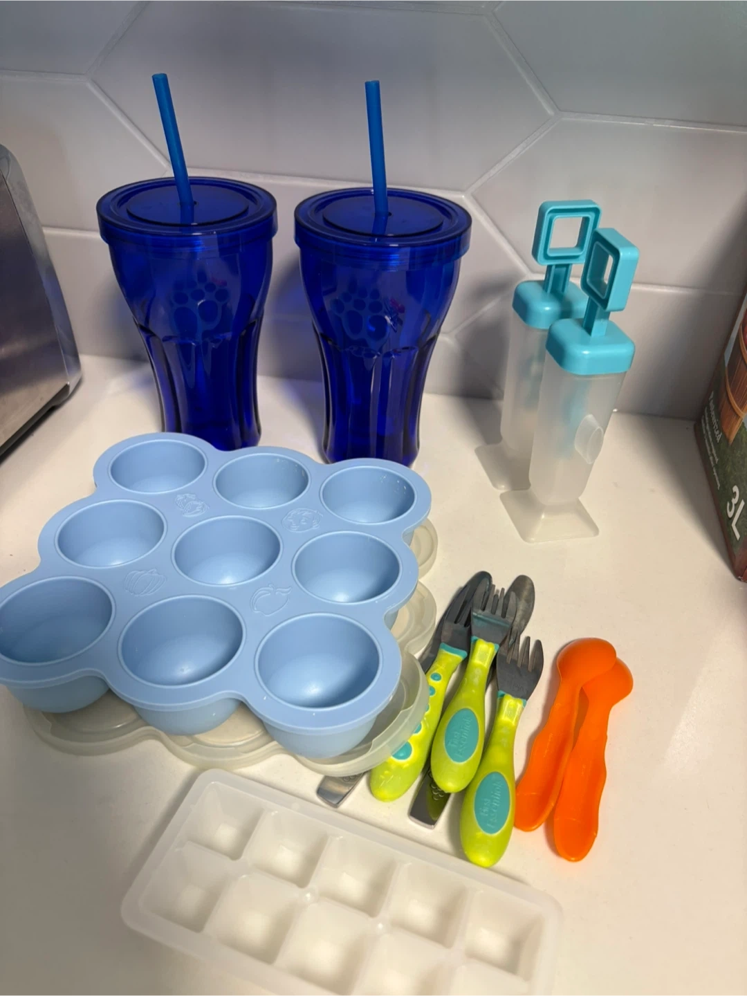 Included are two blue cups with straws, a blue silicone egg bite mold, popsicle molds, cutlery, and an ice cube tray. Great for starting solids or making fun treats for the little ones.