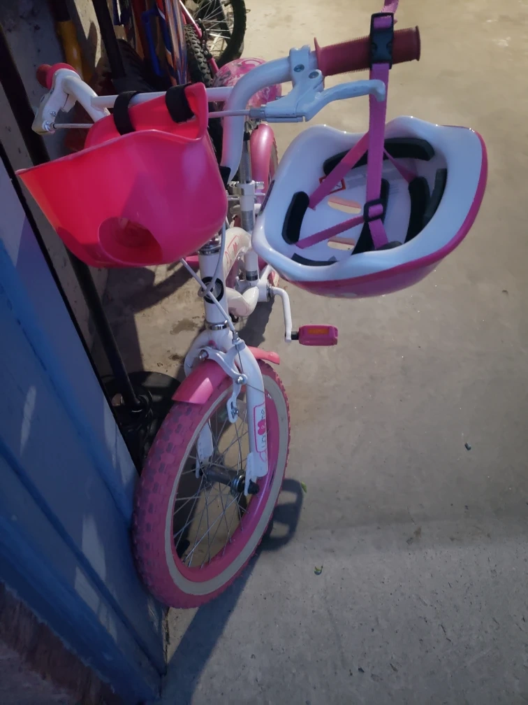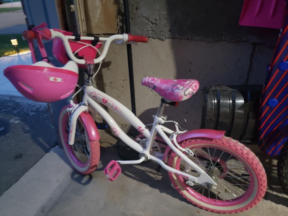 Little used and works like new and in perfect condition. "Avigo" "You & Me Doll Bike" 16 inch. Kid girl bike for sale. Selling 16 inch bike size with 1 free girls helmet and 1 free small doll helmet with free basket to put your doll in. Adding 4 more free accessories(stand, front & back reflector lights and bike Bell). No training wheels. If the add is up then item is still available.