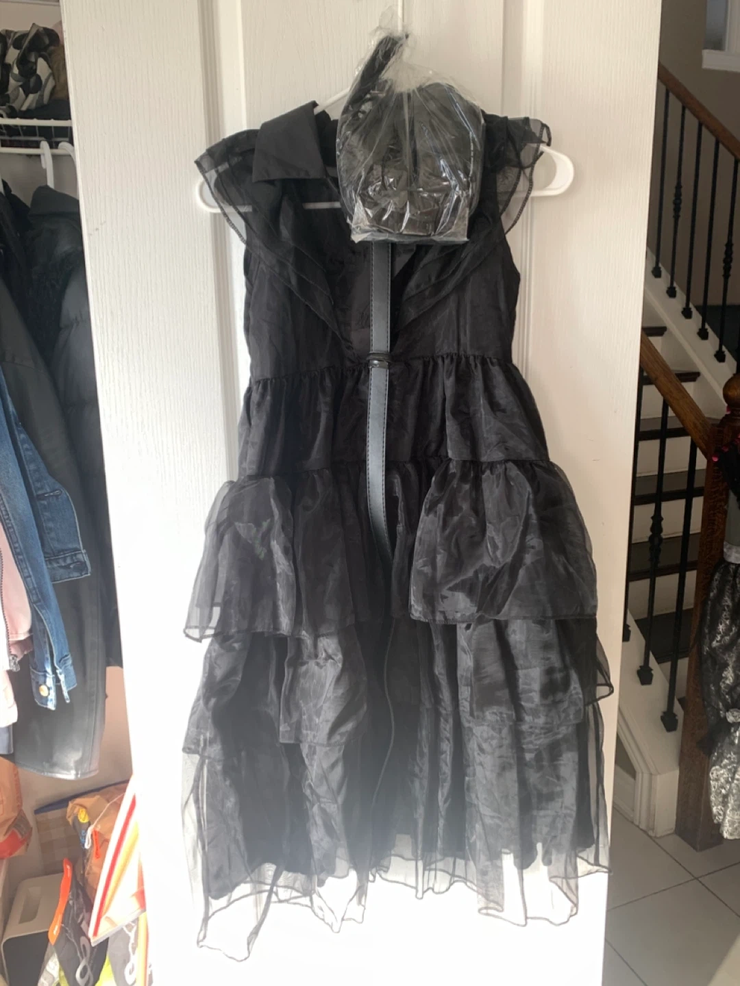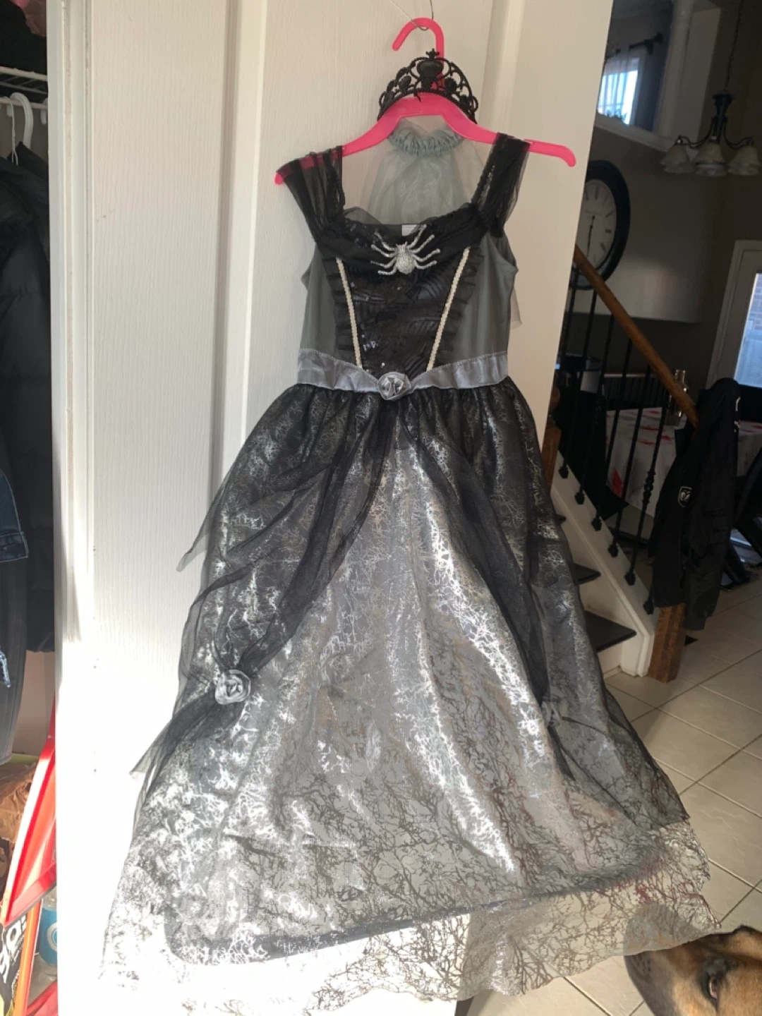 Selling a couple of kids' Halloween costumes. One is a black dress with layered ruffles and a belt (Wednesday Addams Costume) comes the Wednesday wig. Girls size 10 $25 The other is a black and silver spider-themed dress with a tiara. Girls size 7/8 $20 The last one is a ride on Dino costume. Its eyes light up and he roars when the button on the neck is pushed. Fits toddler 4/5 $25 All from clean smoke free home. Excellent condition. Pick up in Innisfil