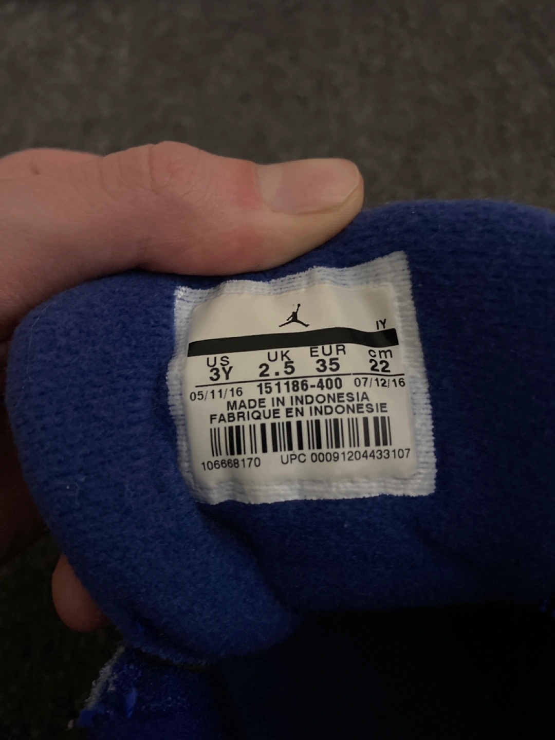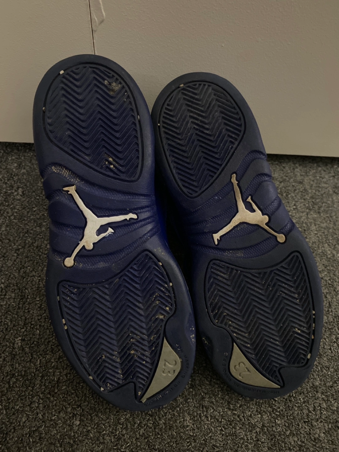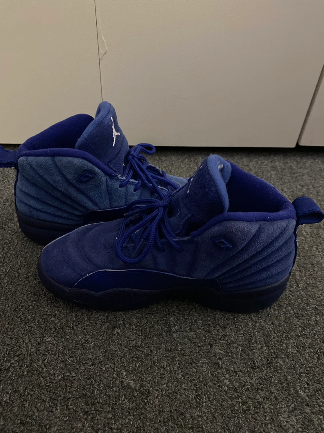 Pair of blue suede Jordan Retro 12 sneakers. Size 3Y. Made in Indonesia. they are real Pre-owned, some wear.