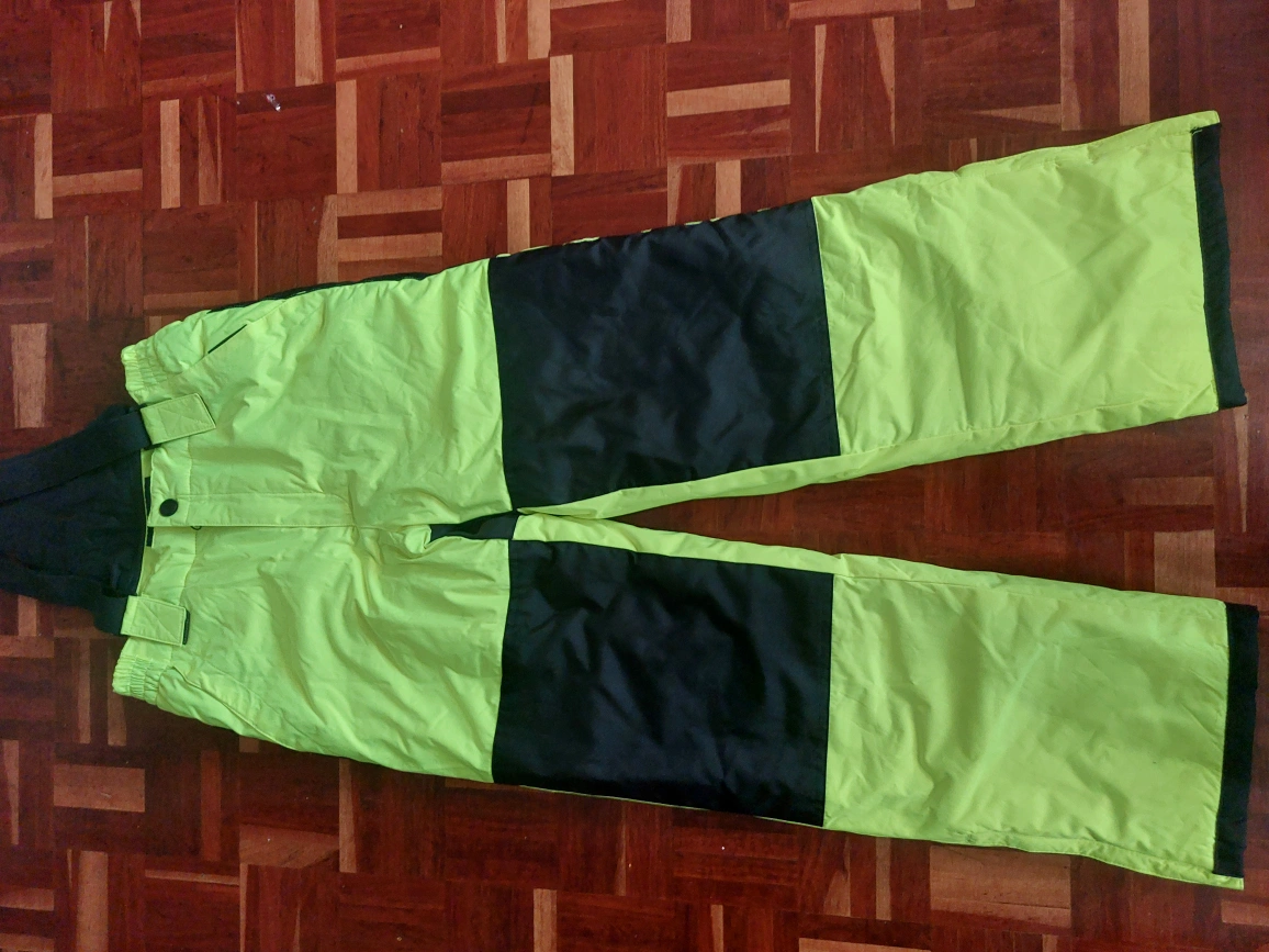 Youth snow pants. Lime green with black panels. Adjustable suspenders. Good for winter activities. Size youth 14-16
