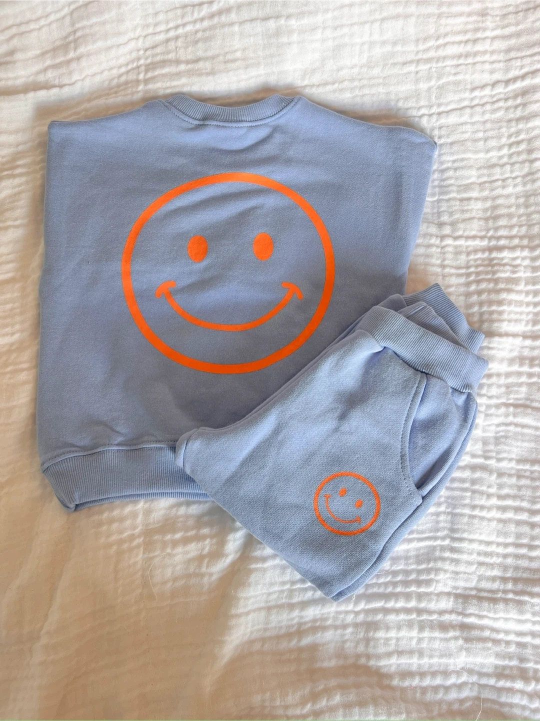 A cute and comfy matching set for your little one! This set includes a sweatshirt with "Hi" on the front and pants with a smiley face. The material is soft and perfect for everyday wear. Available in a light blue colour.
