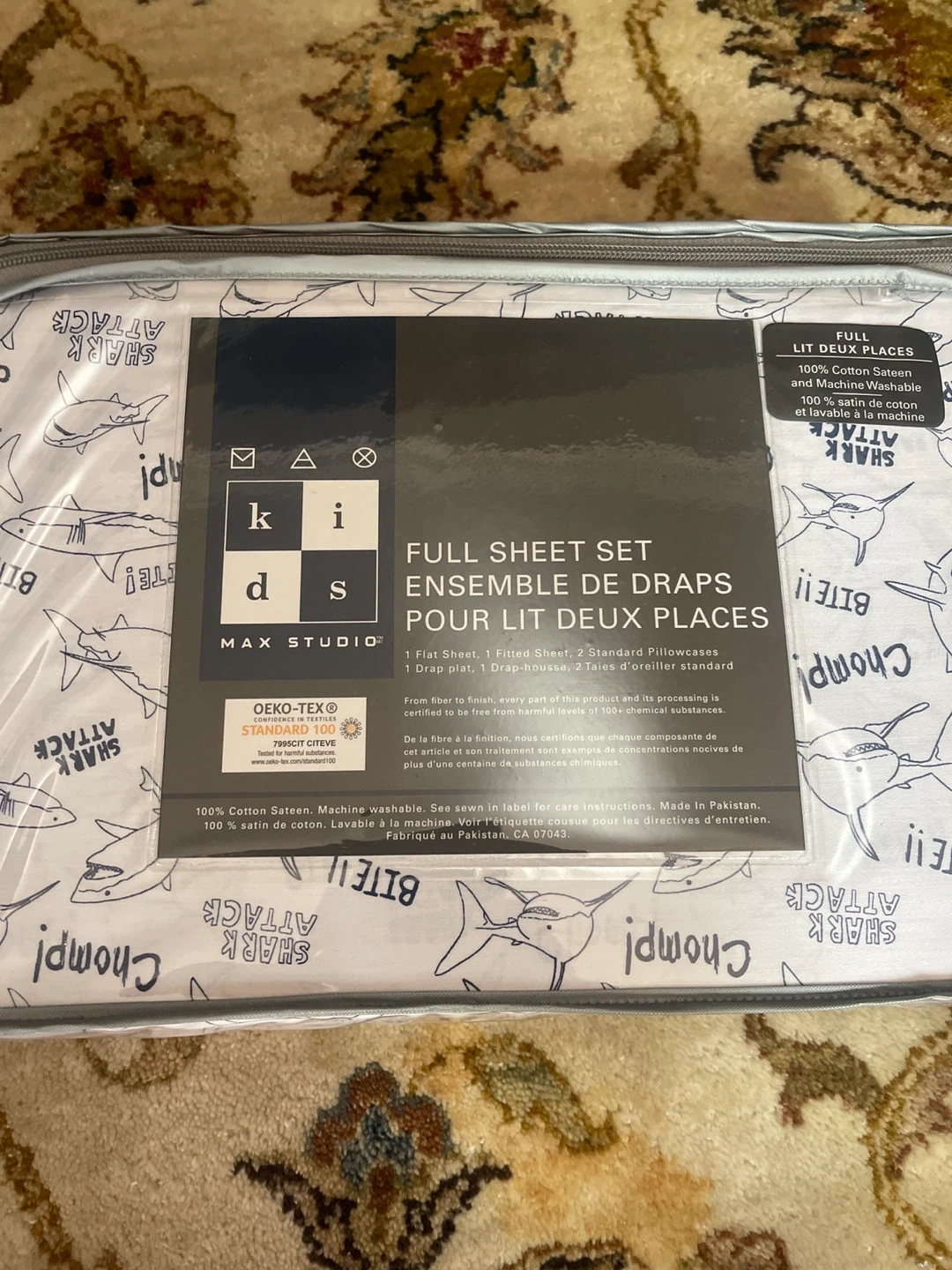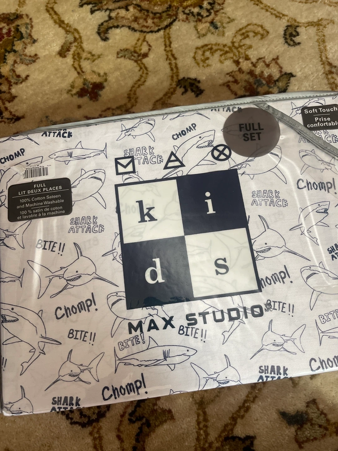 Keep your kiddo comfy with this full sheet set from Kids Max Studio! The set features a fun shark attack pattern. It includes one flat sheet, one fitted sheet, and two standard pillowcases. Made from 100% cotton, it's also machine washable