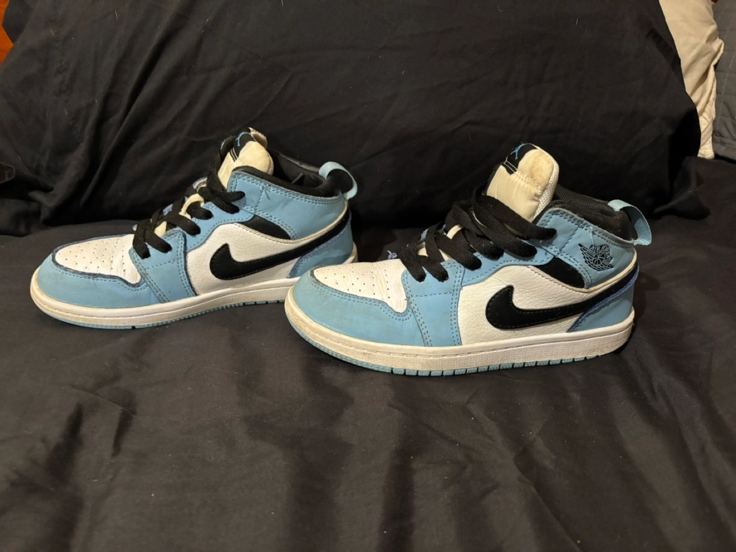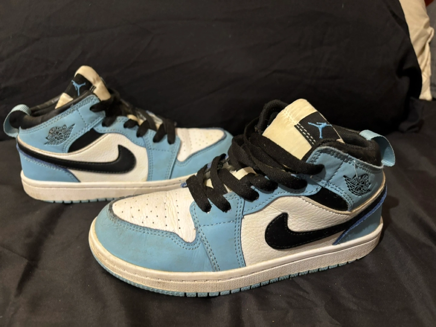 Pre-owned Air Jordan 1 Mid SE sneakers. Light blue and black colourway. Size 2Y. Minor wear. Great for everyday use.
