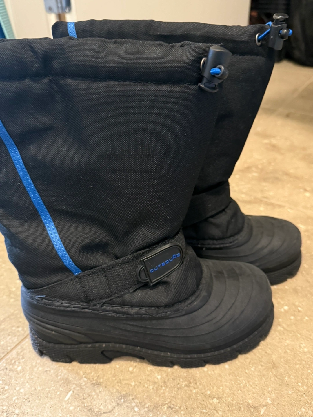 Black winter boots with blue accents. Features a hook and loop closure. You can also remove the liner for just rain or with liner as snow boots.