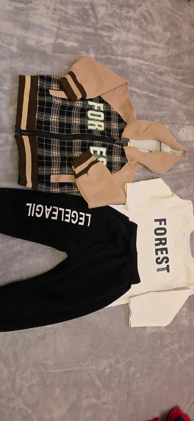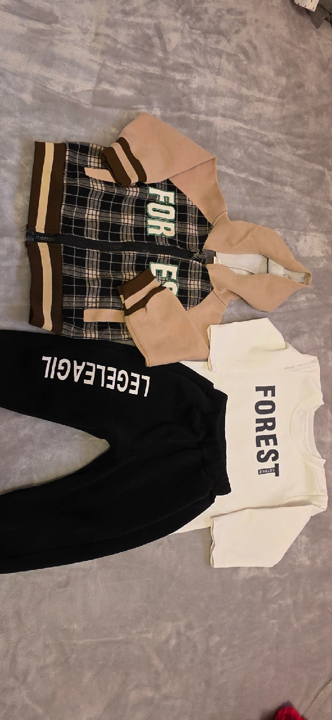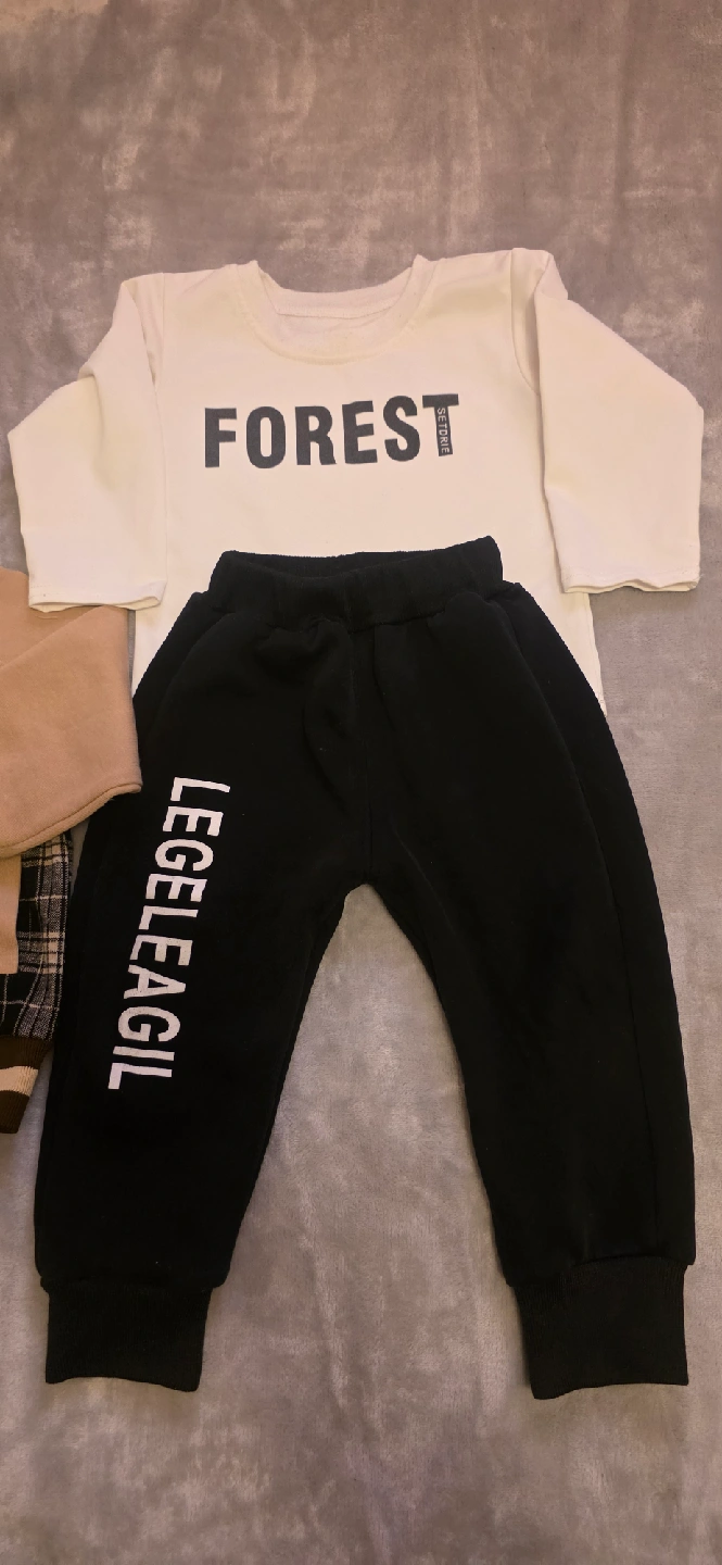 Selling a cute kids' outfit! It includes a long-sleeved white t-shirt with 'FOREST' printed on it and black pants with 'LEGELEAGIL' on the side. The outfit also includes a plaid jacket with a hood and brown accents. 2- 3 year