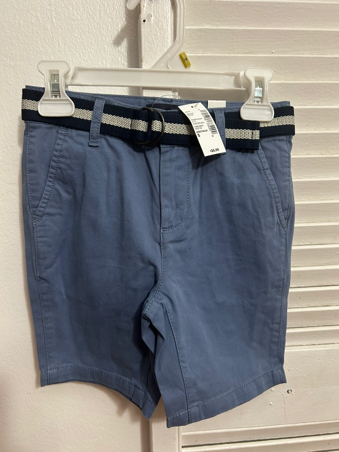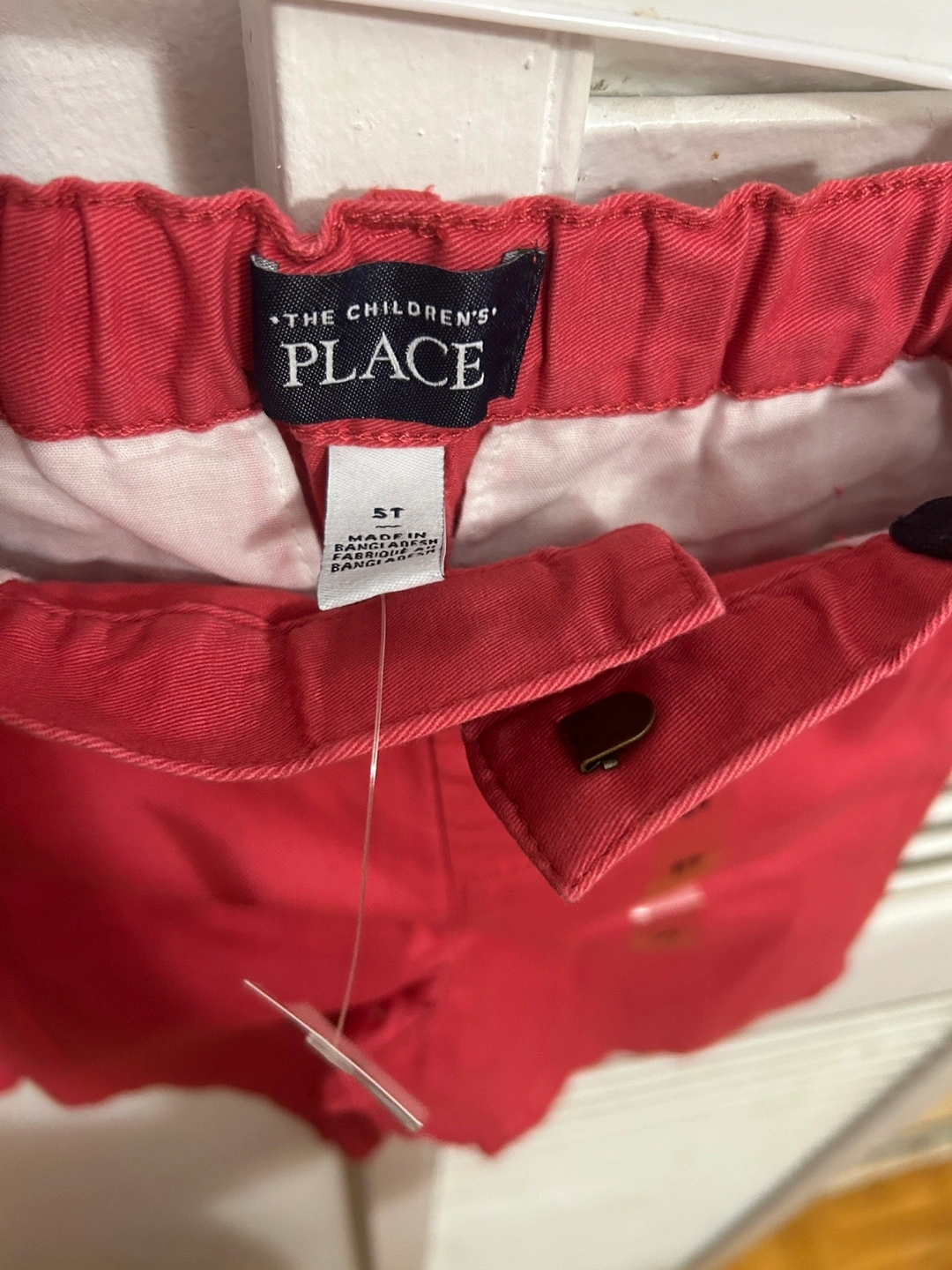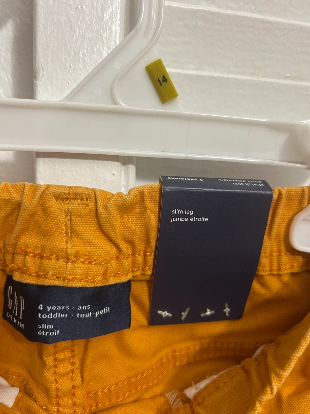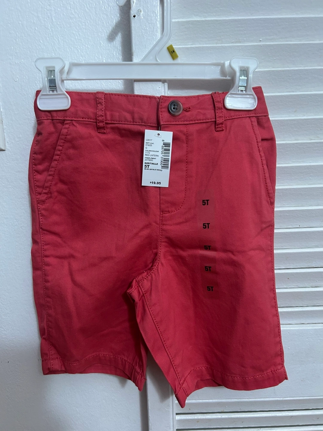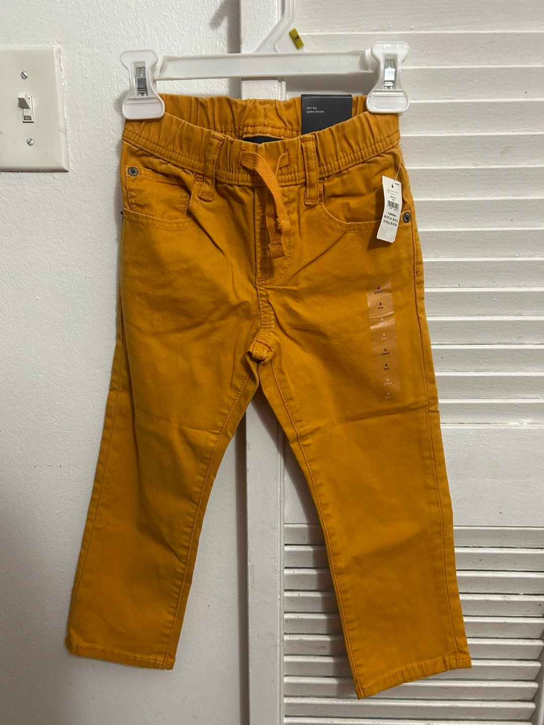 Bundle includes three pairs of children's bottoms. One pair of mustard yellow Gap toddler slim leg jeans, size 4 years. Two pairs of The Children's Place shorts: one red, size 5T; one blue, size 5. All new with tags.