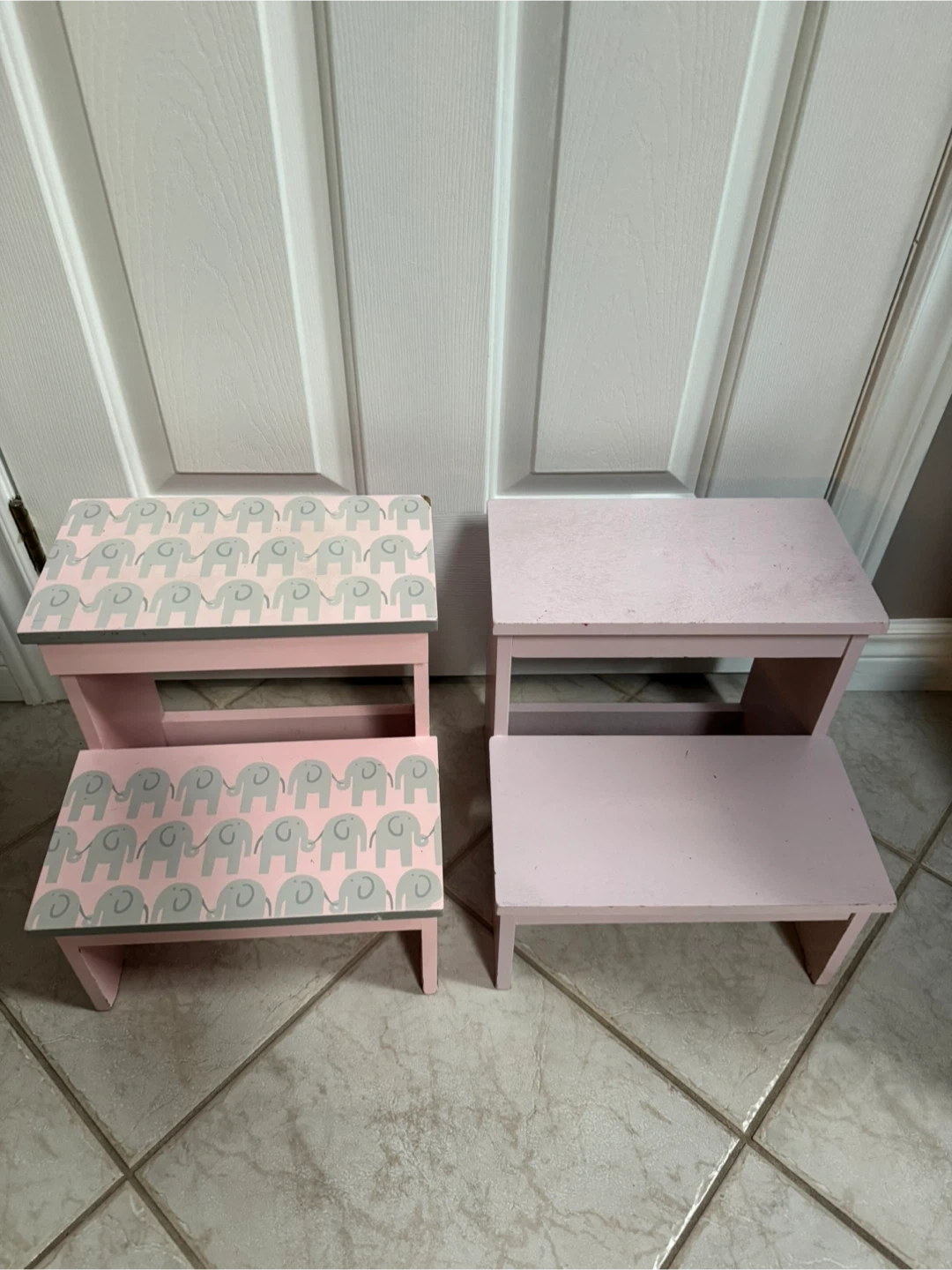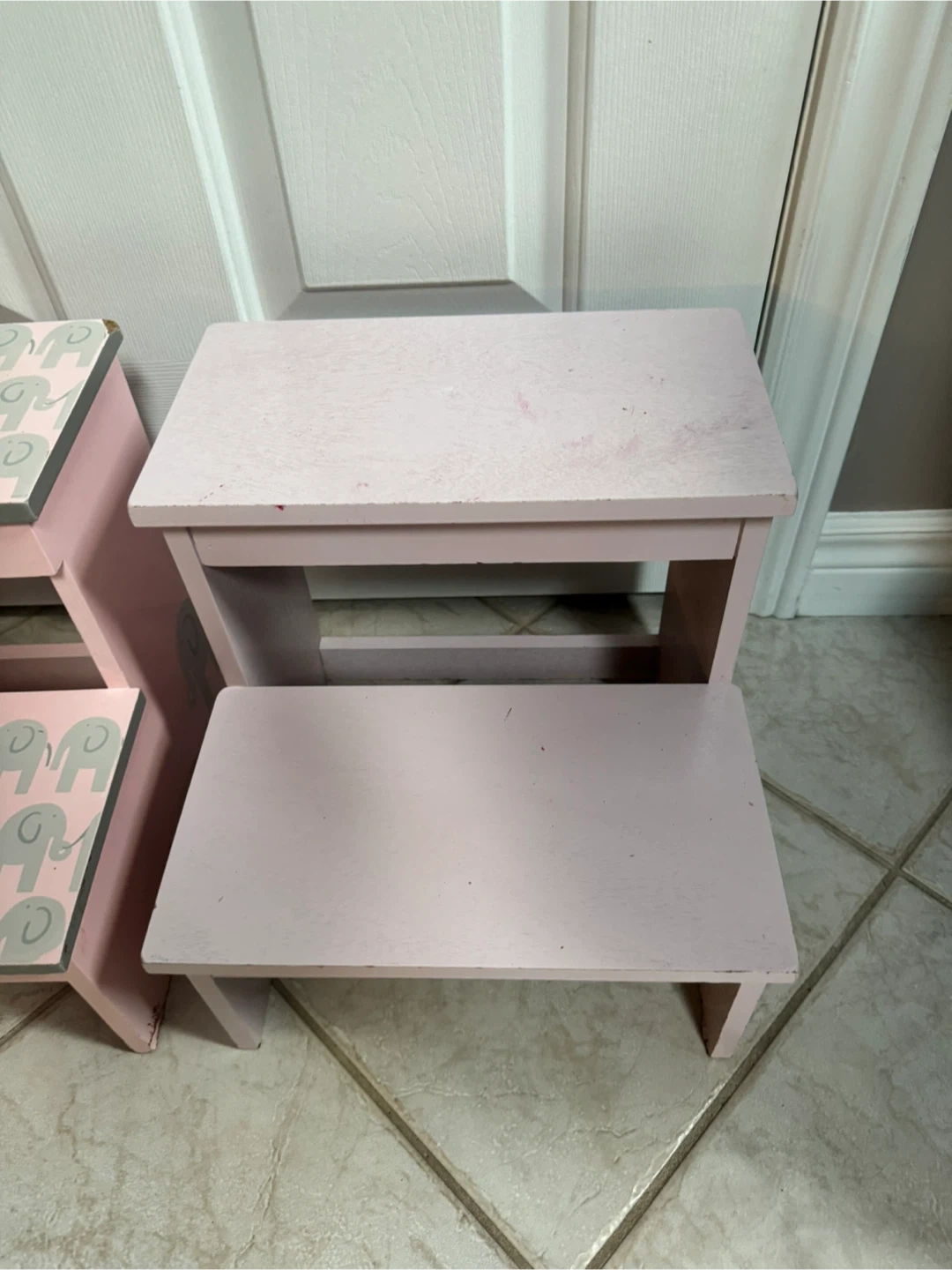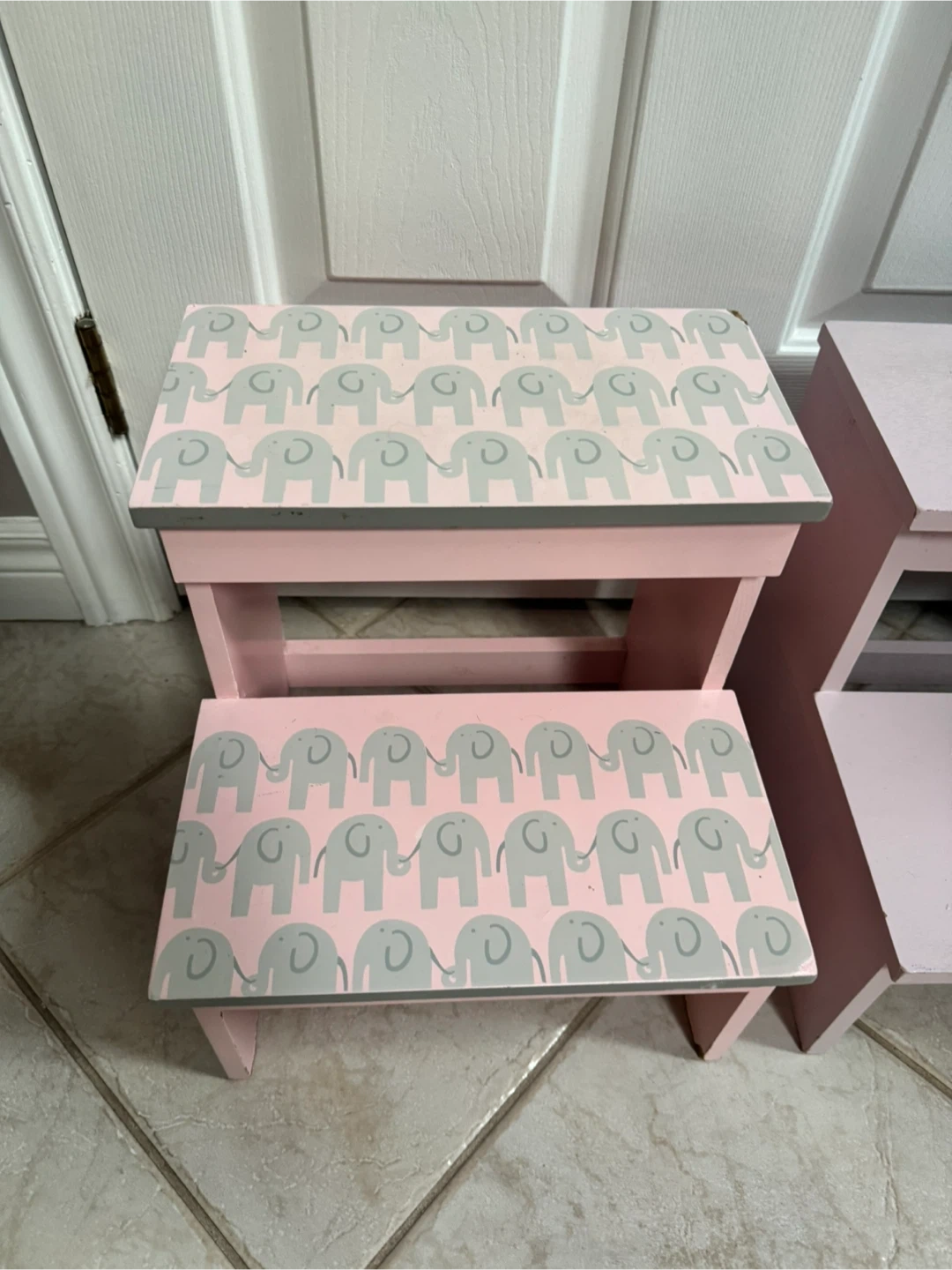 Here's a cute pink step stool for kids! It has a sweet elephant pattern on the top steps. Perfect for helping little ones reach the sink or climb into bed. It's in good condition and ready for a new home