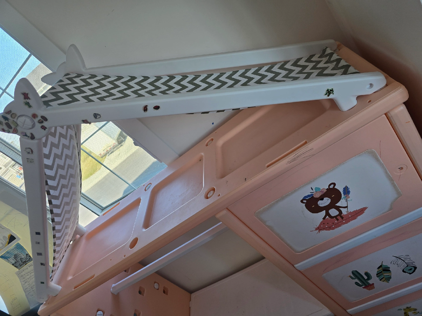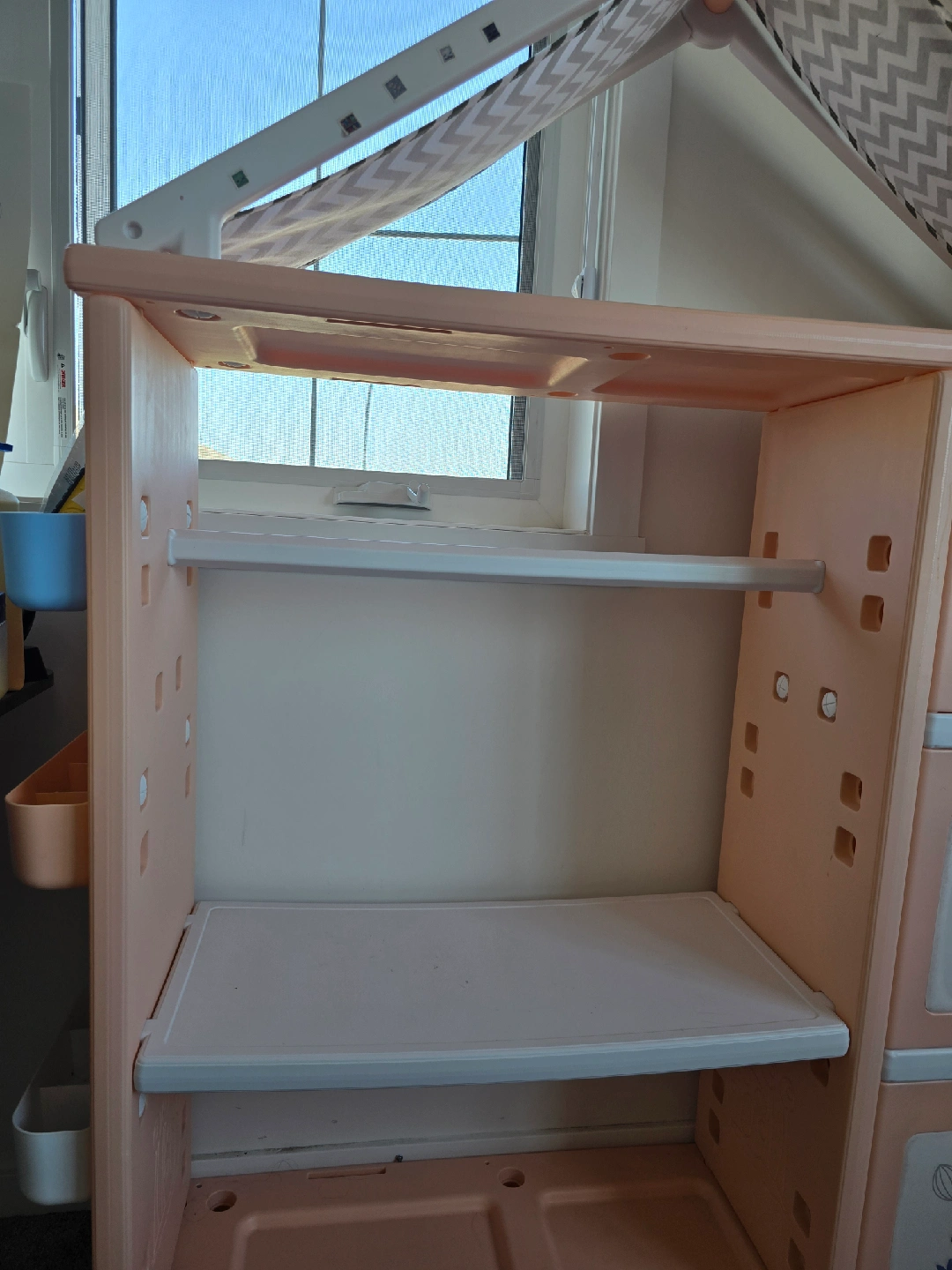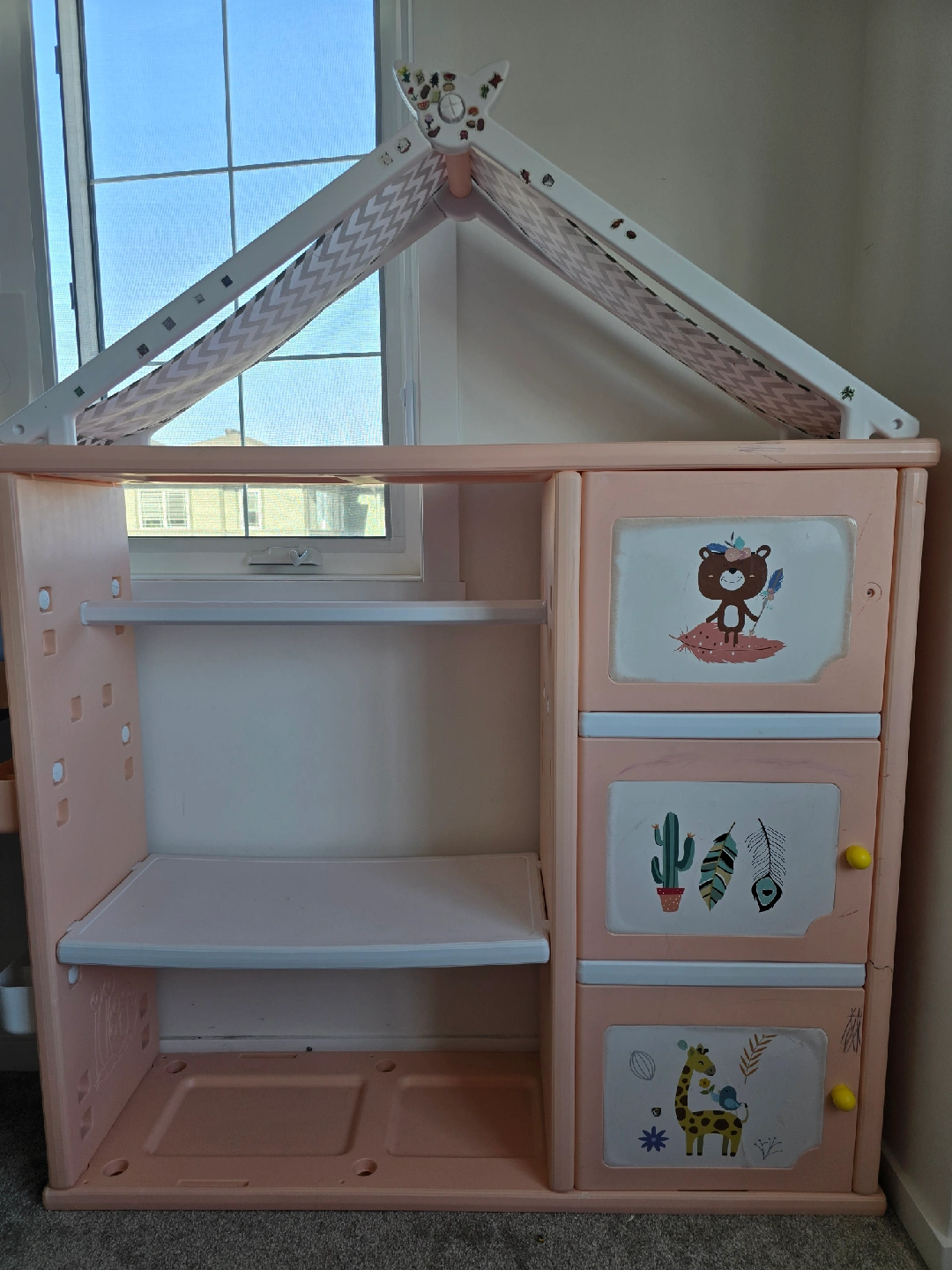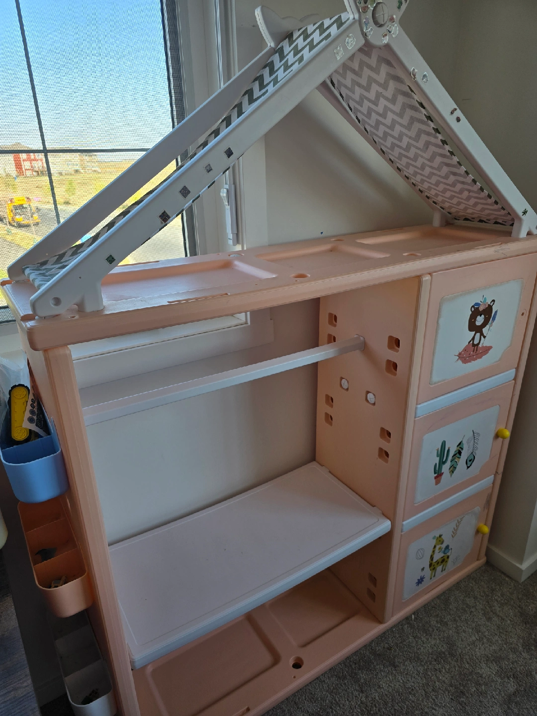 This adorable kids' shelf features a fun play tent design in pink and white. It's perfect for organizing toys, books, or displaying cherished items. The cute bear and plant illustrations add a playful touch to any room. It's in good condition and ready for a new home!