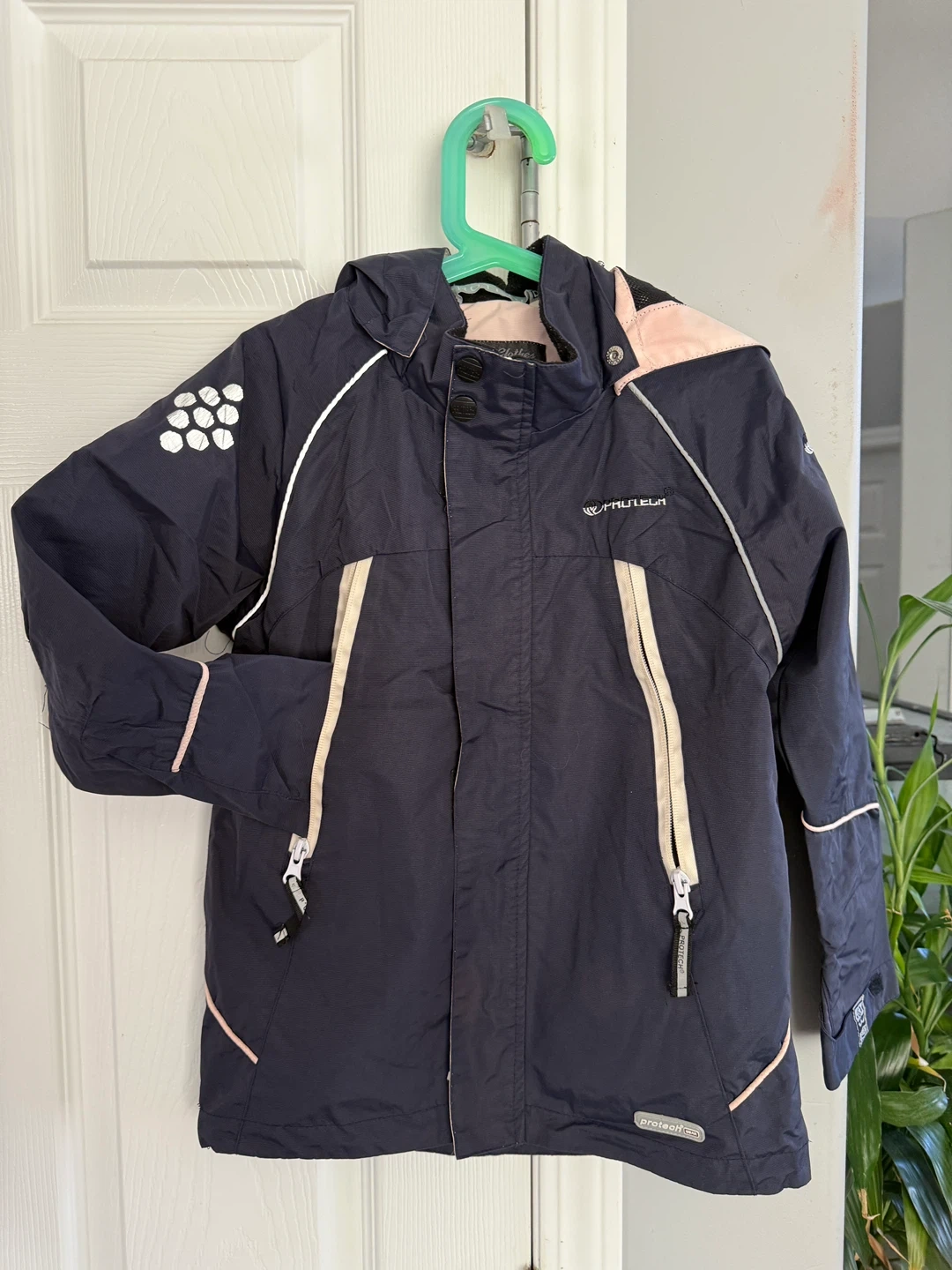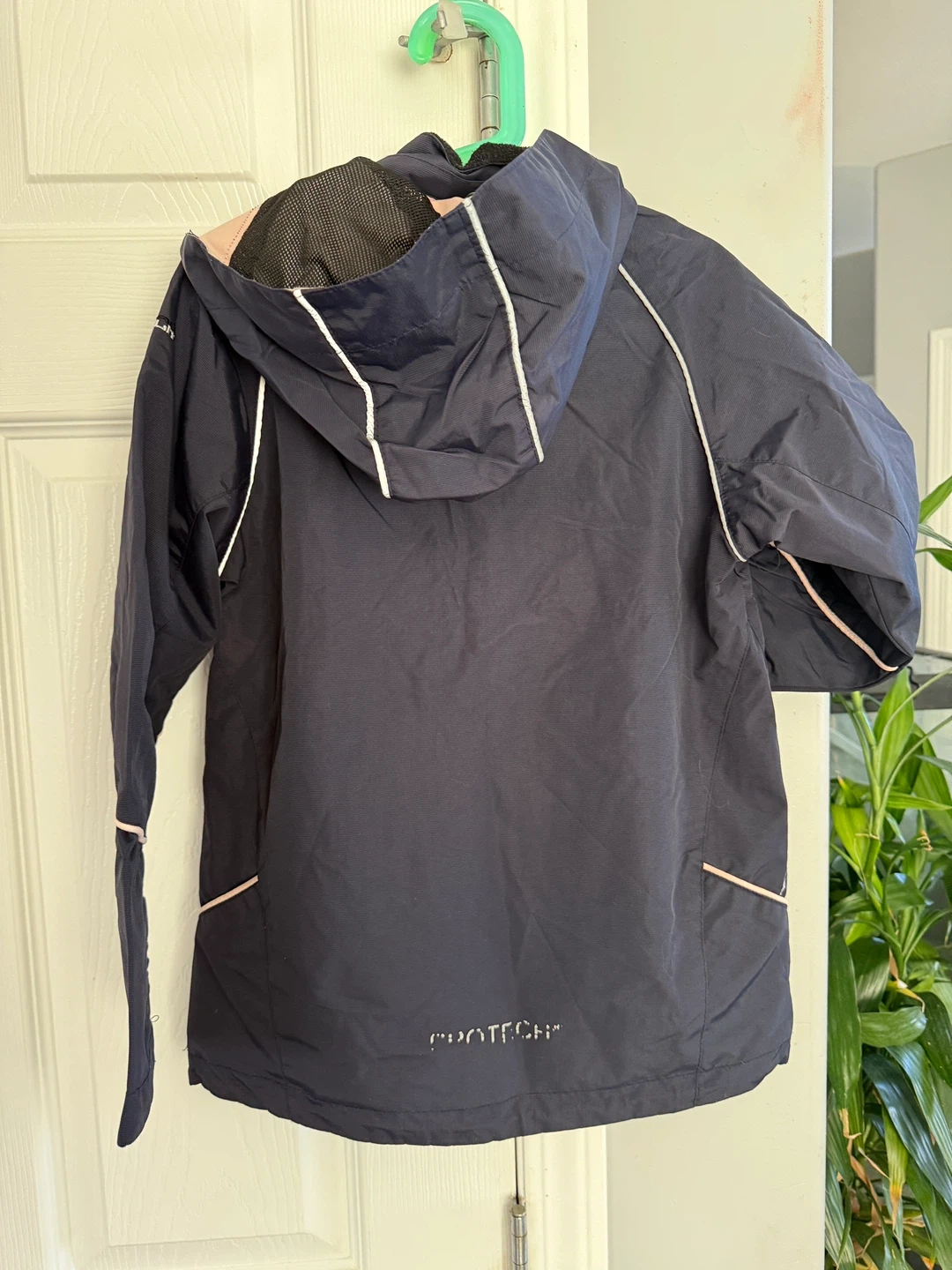 Kids PROTECH jacket in navy blue. It has a hood and pockets. Great for outdoor activities!