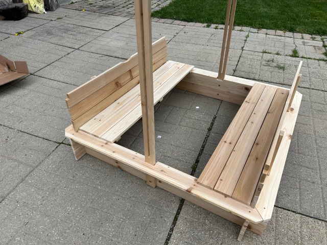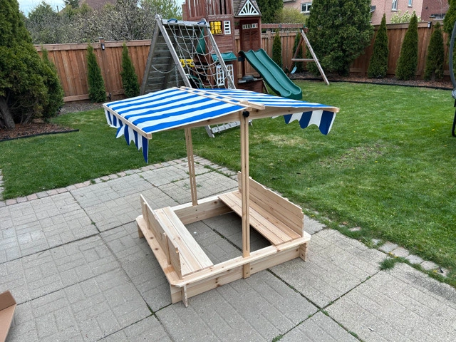Brand new, assembled kids sandbox. Has two bench seats and adjustable canopy to protect kids from the sun. Great gift for the little ones.