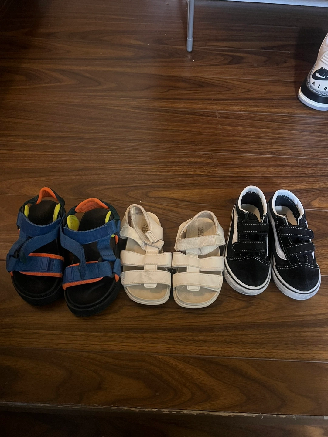 Selling a collection of kids' sandals and Vans. There are two pairs of sandals (size 7-8C), one in blue and orange, and another in white. Also included is a pair of black and white Vans (size 8C). All are in good condition. Selling all together for $30