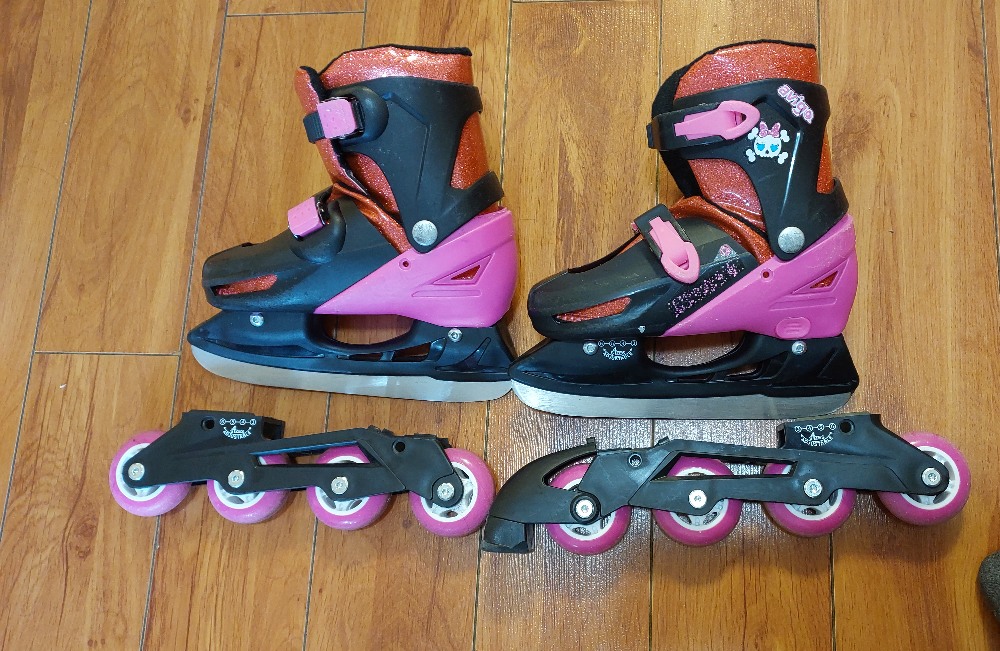 Skates, the screws which allow to change the blades is kind of stuck. good for kids who are learning ice skating as the blades are not that sharp.