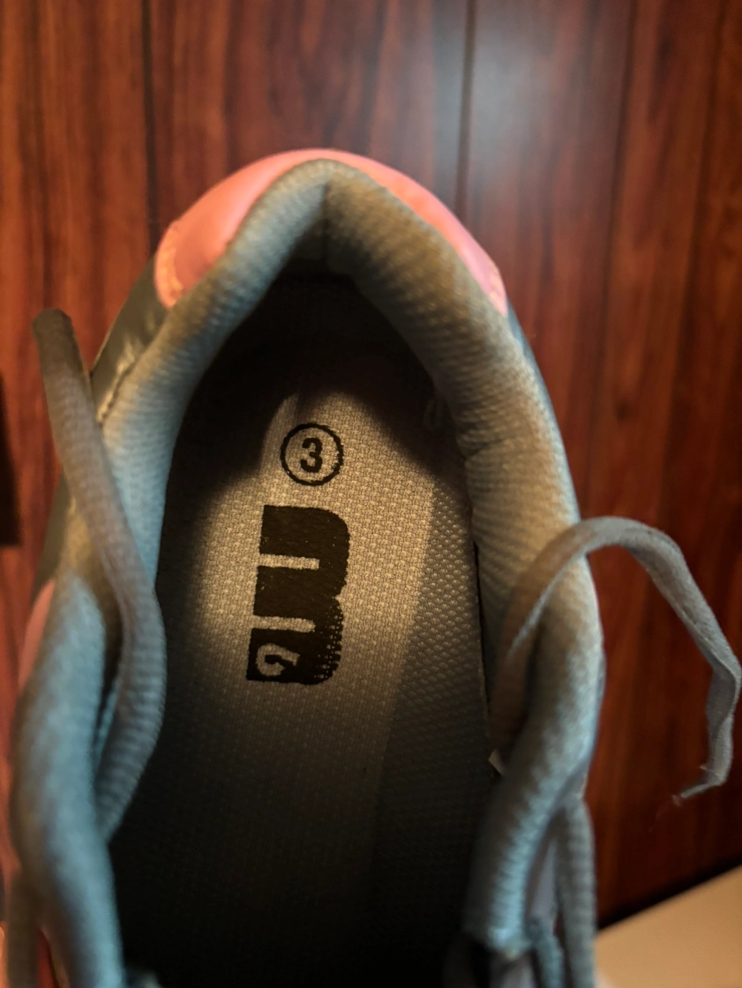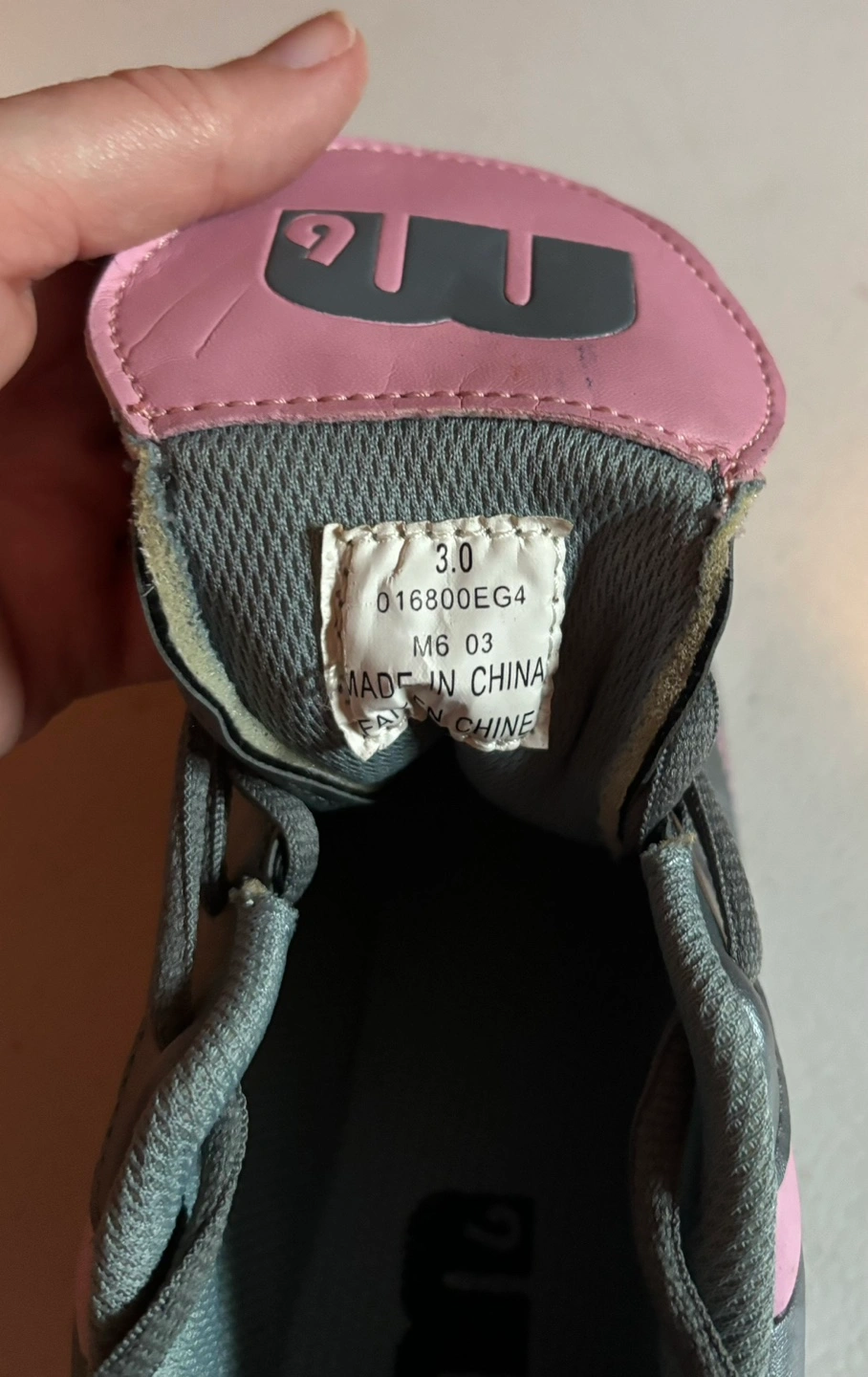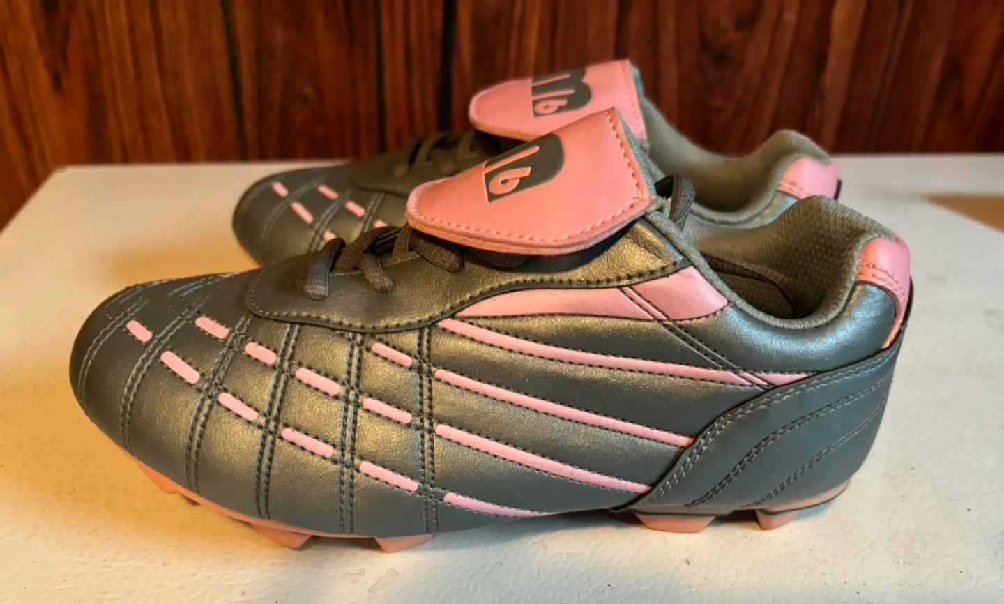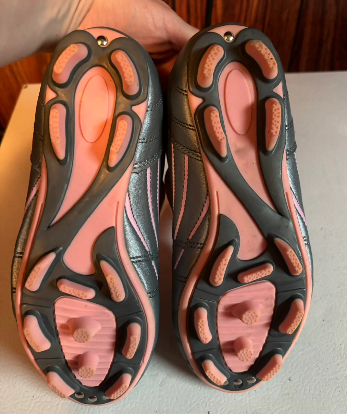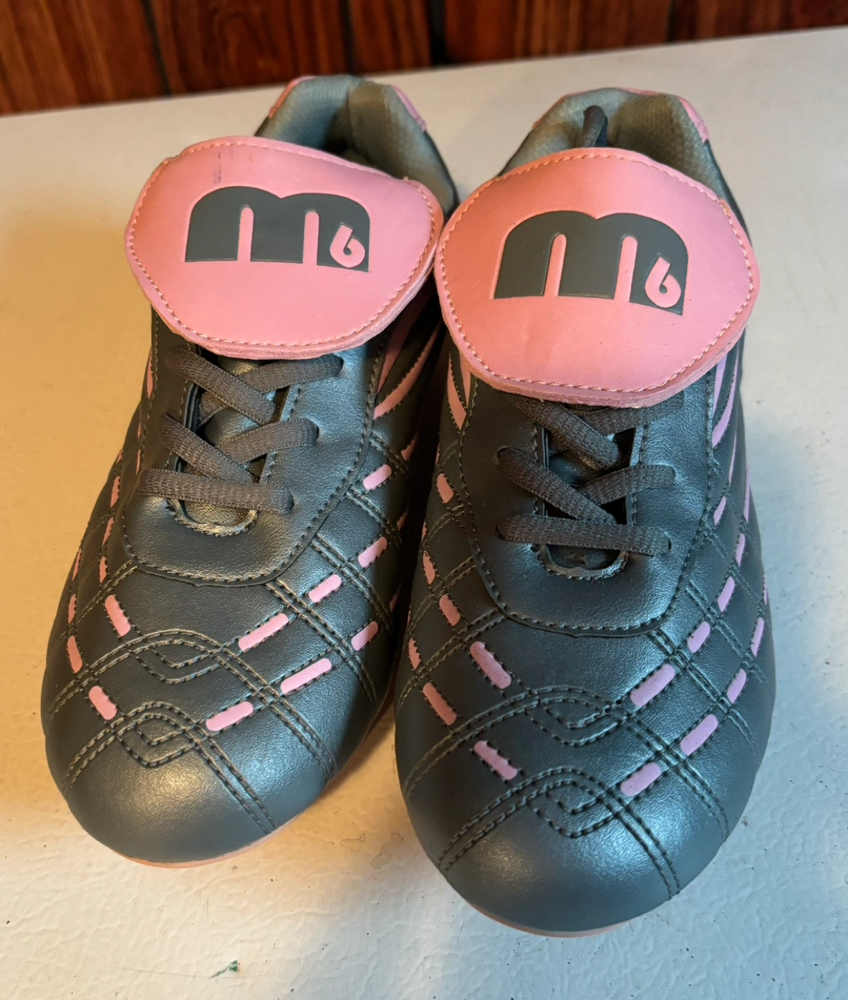 Size 3 - M6 Soccer Cleats in grey and pink.