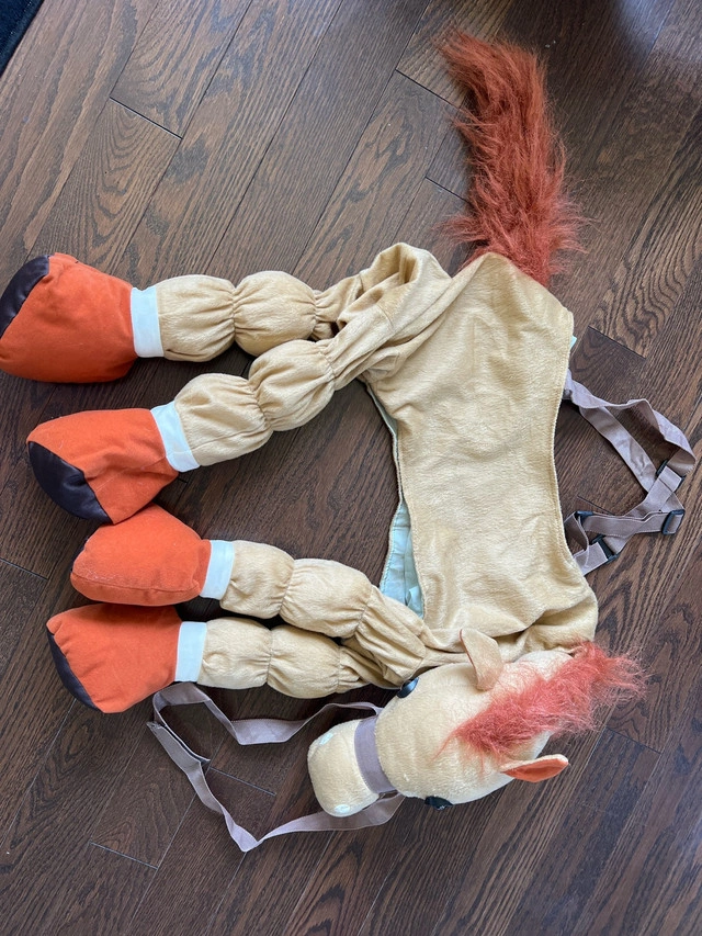 Giddy up for some fun with this new child-sized horse costume! Perfect for Halloween or dress-up, this ride-on costume will surely bring smiles and laughter. It's in good condition and ready for a new adventure. This playful costume is ready to gallop into your child's imaginative playtime!