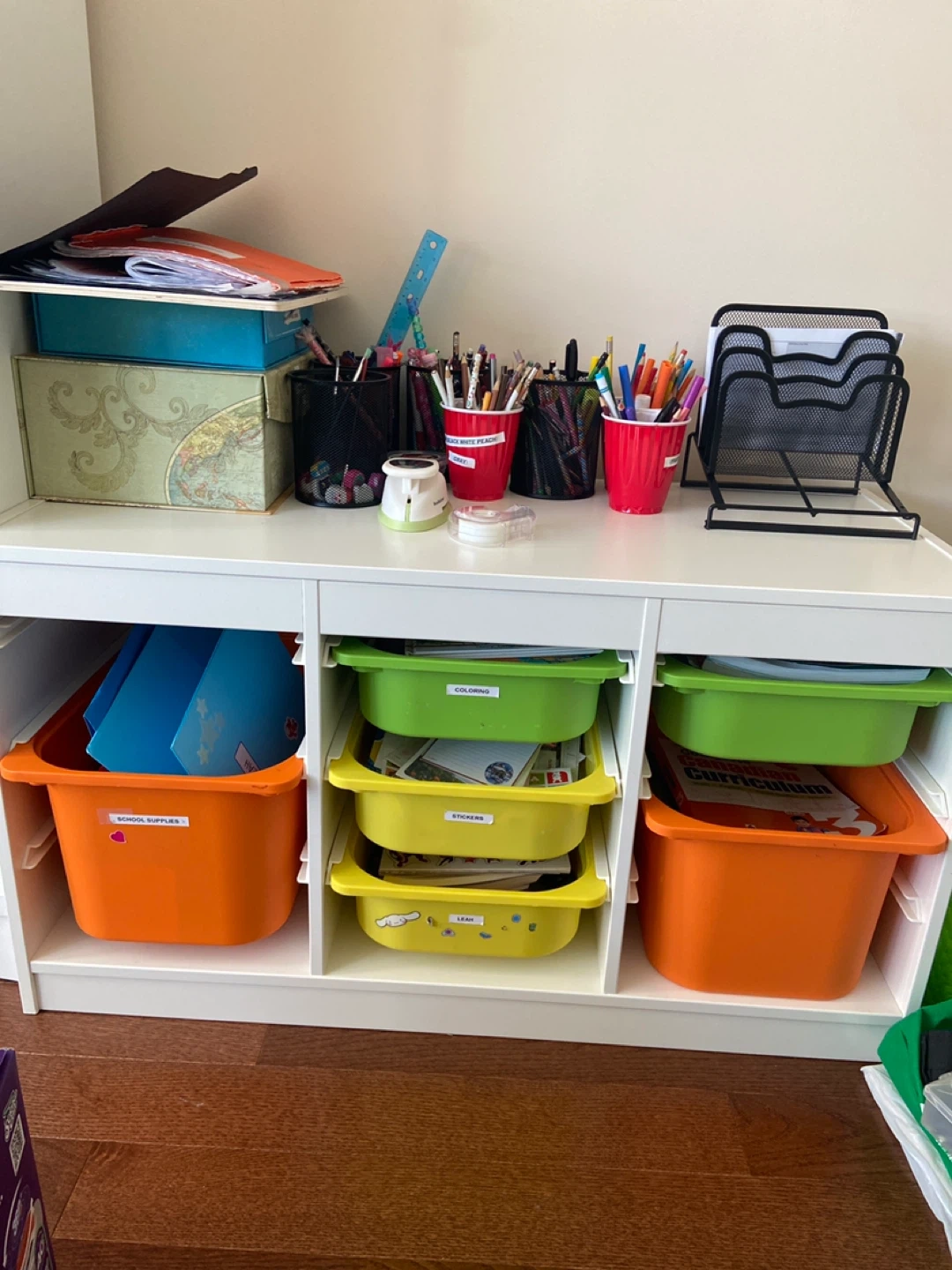 Decluttering the kids' space! I have some colourful storage bins available. They're perfect for organizing school supplies, art materials, stickers, and more. Great for keeping things tidy and easily accessible for little ones