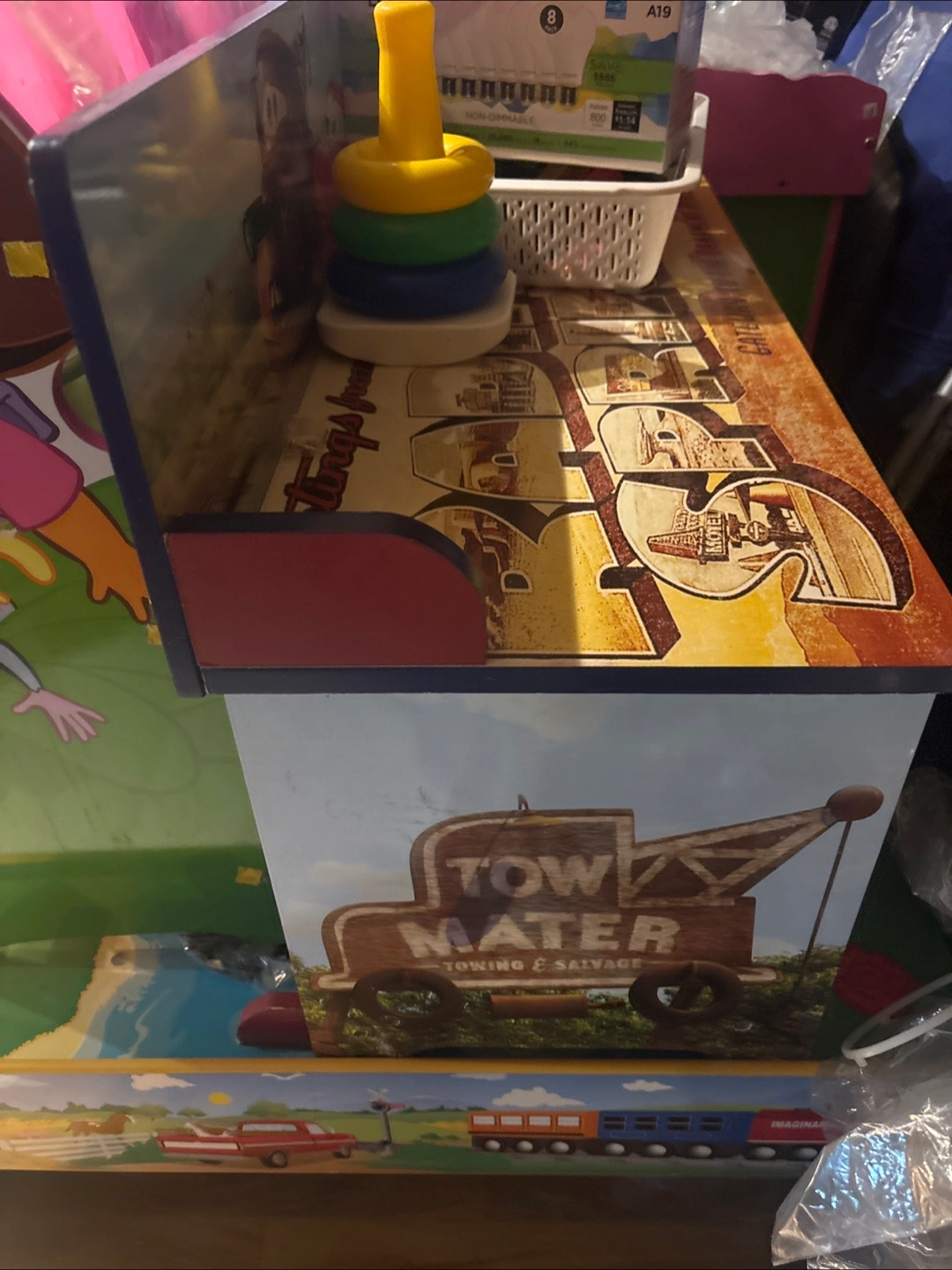 A kids' storage unit. Features multiple cubby style shelves. Decorated with colourful images. Great for organizing children's toys in a calm environment.