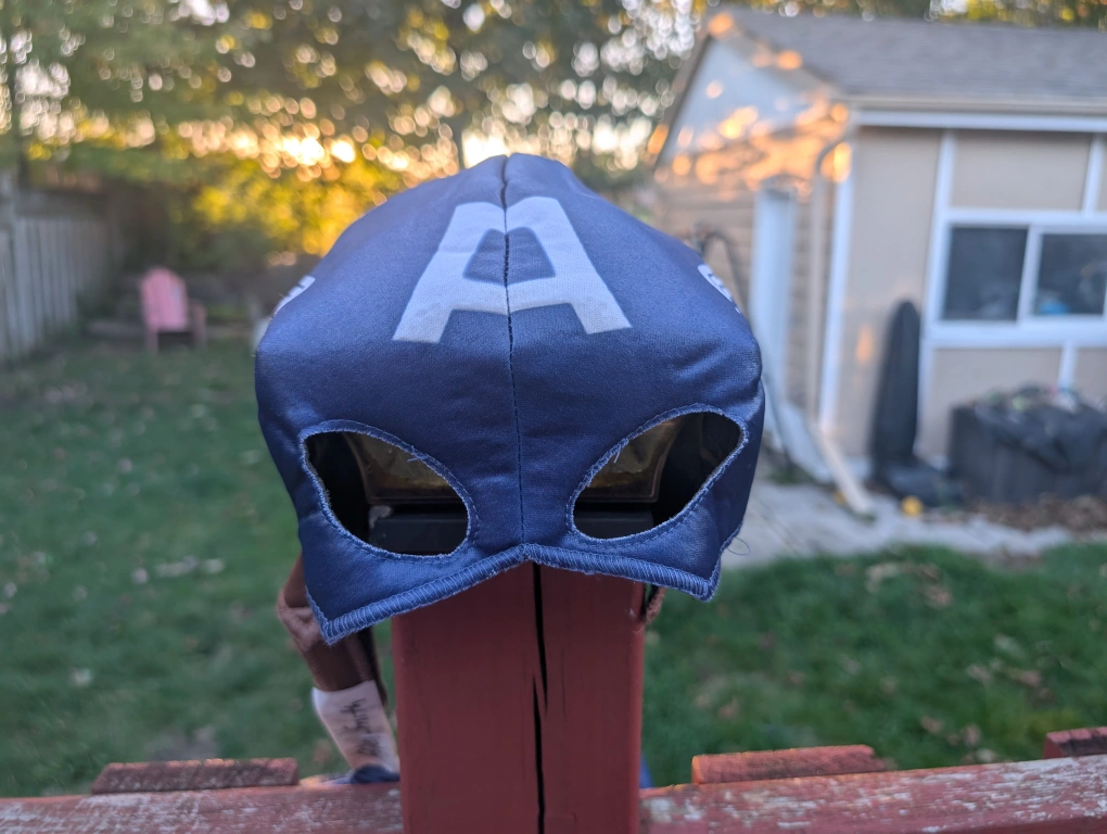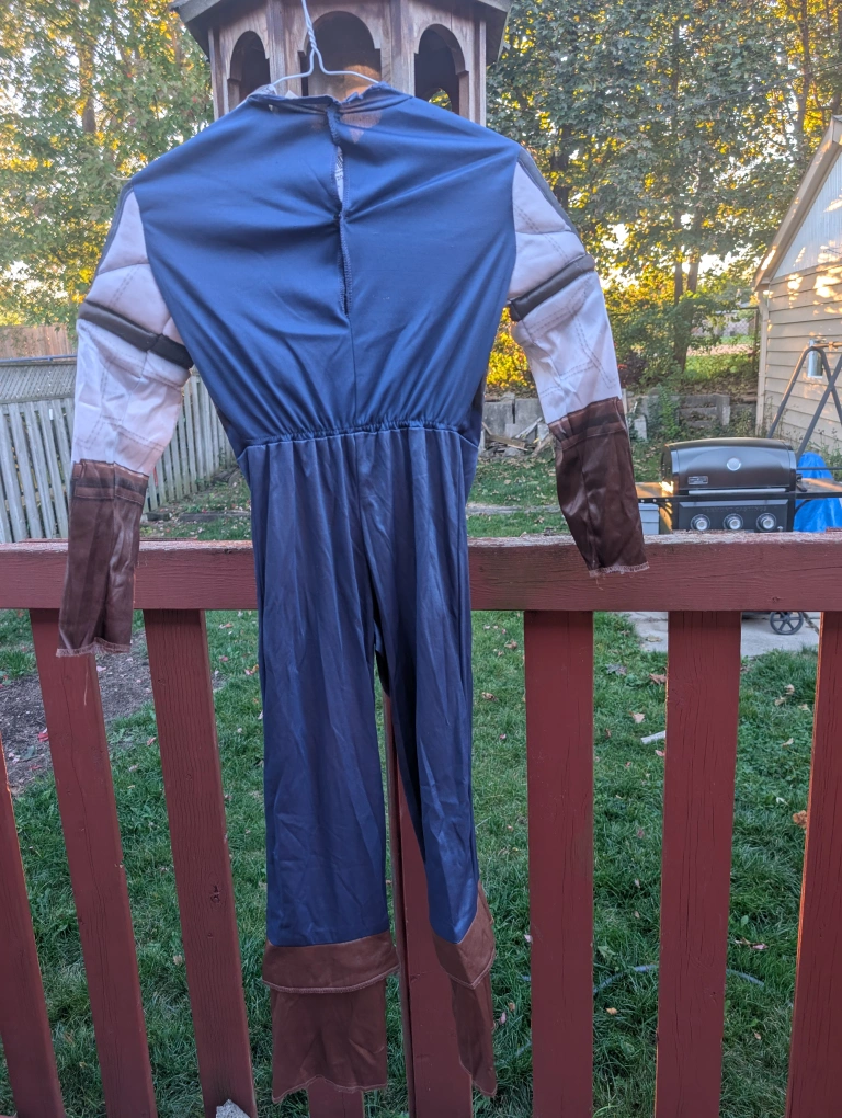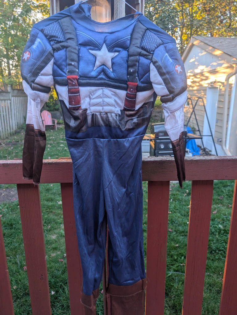 Kids size 7/8 Captain America costume. Very gently worn, velcro closure, padded "muscles", elastic waist, mask included.