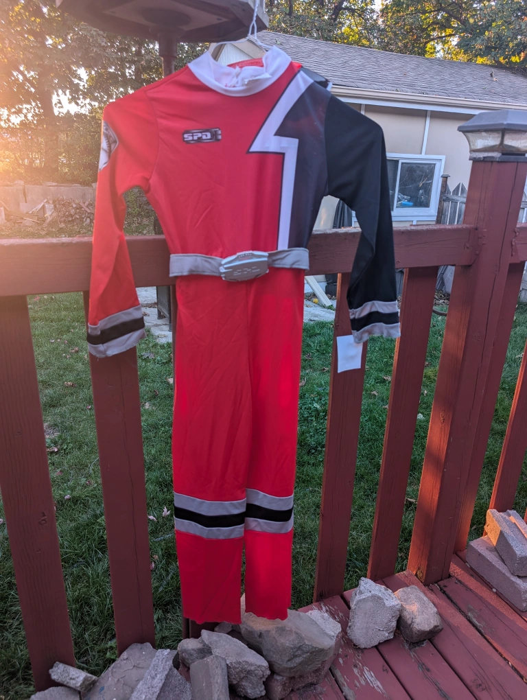 Kids size 7/8 Red Power Ranger costume. Velcro on back. Belt is attached but can easily be removed. Very good condition.