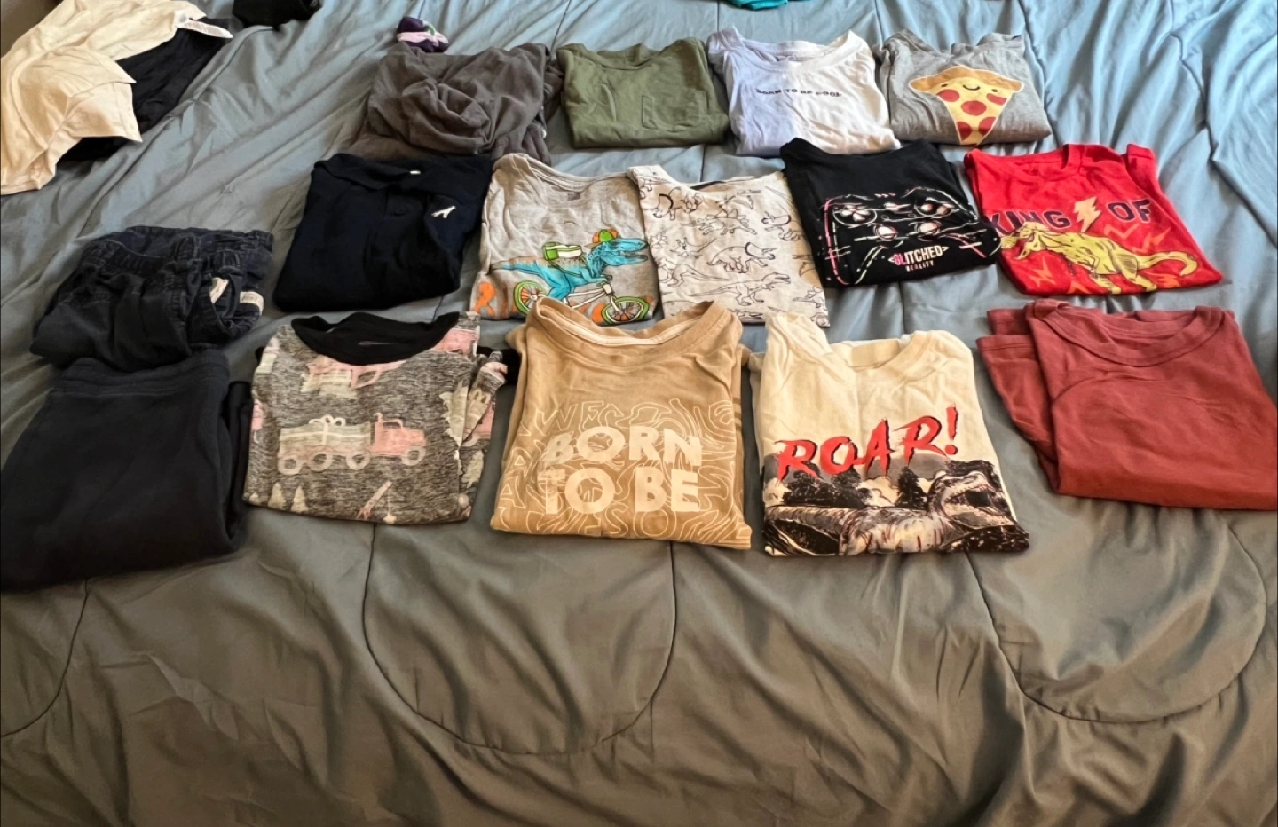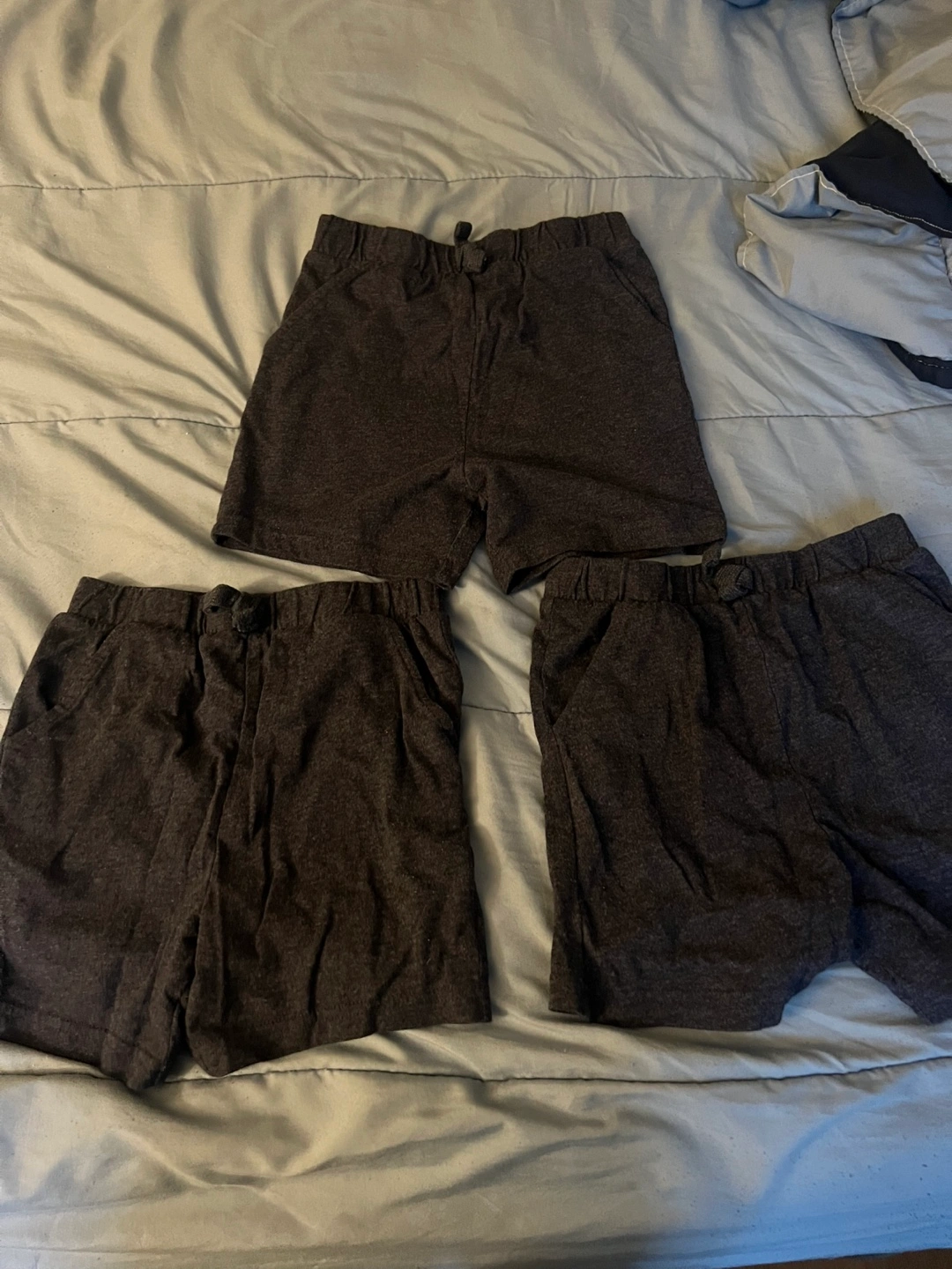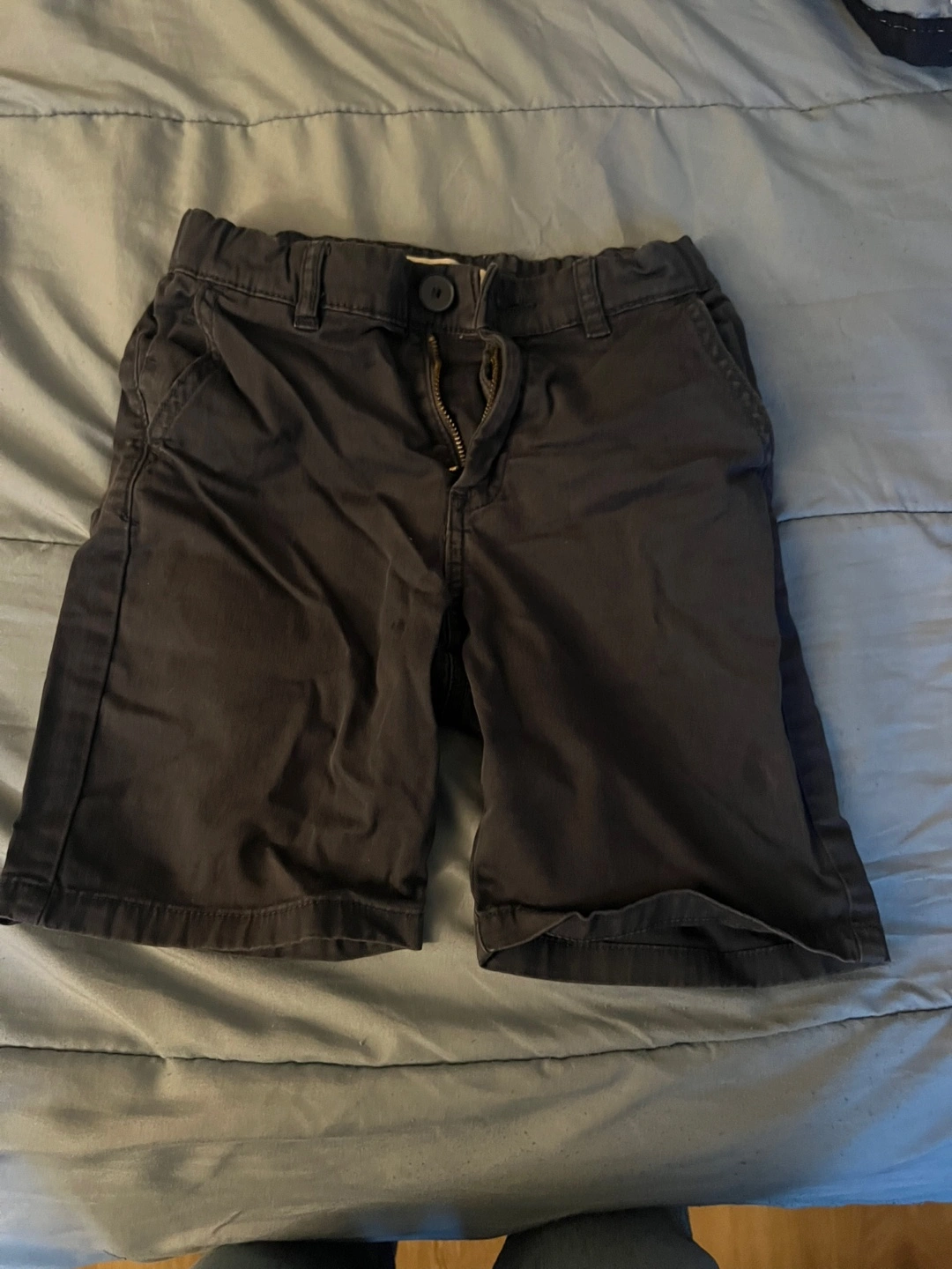 A big bundle of t-shirts. Different colours, prints and patterns. The shirts feature short sleeves. Size 6-8 Boys t-shirts 6 Navy blue shorts