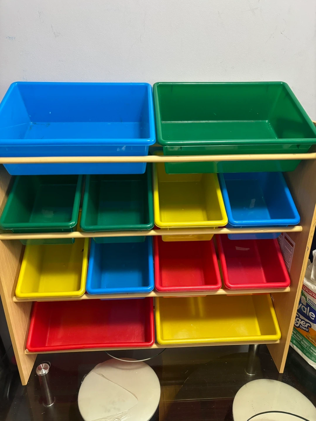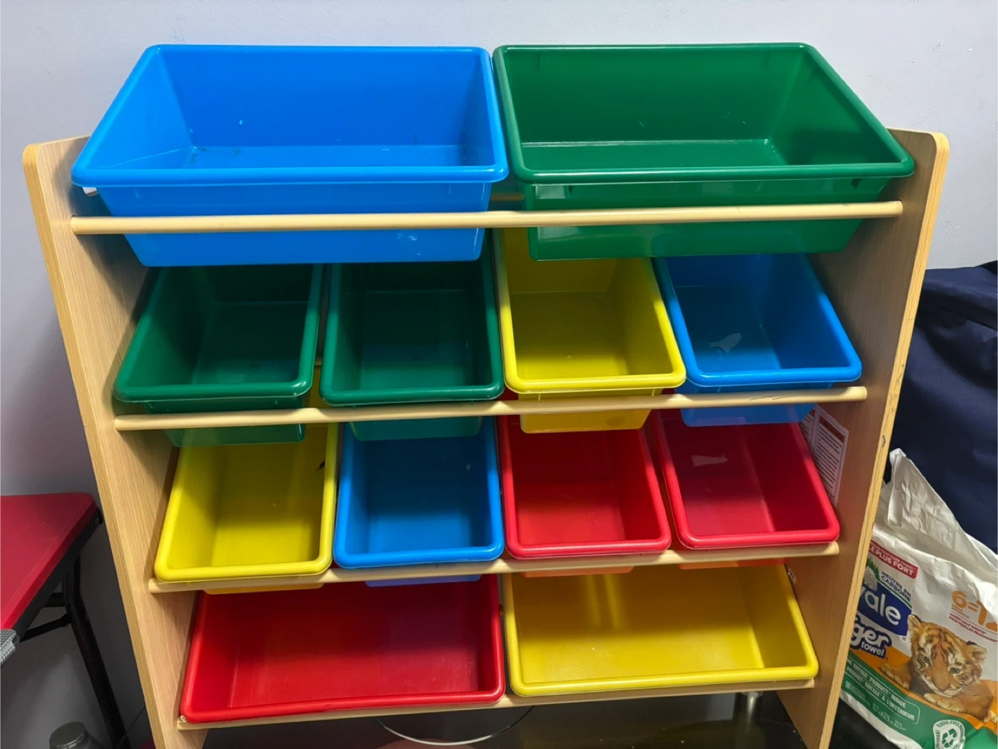 Selling a kids toy storage organizer, perfect for keeping things tidy! It features multiple colourful bins in red, yellow, blue and green. Great for organizing toys, books, and other kids' items. It's in good condition and ready for a new home